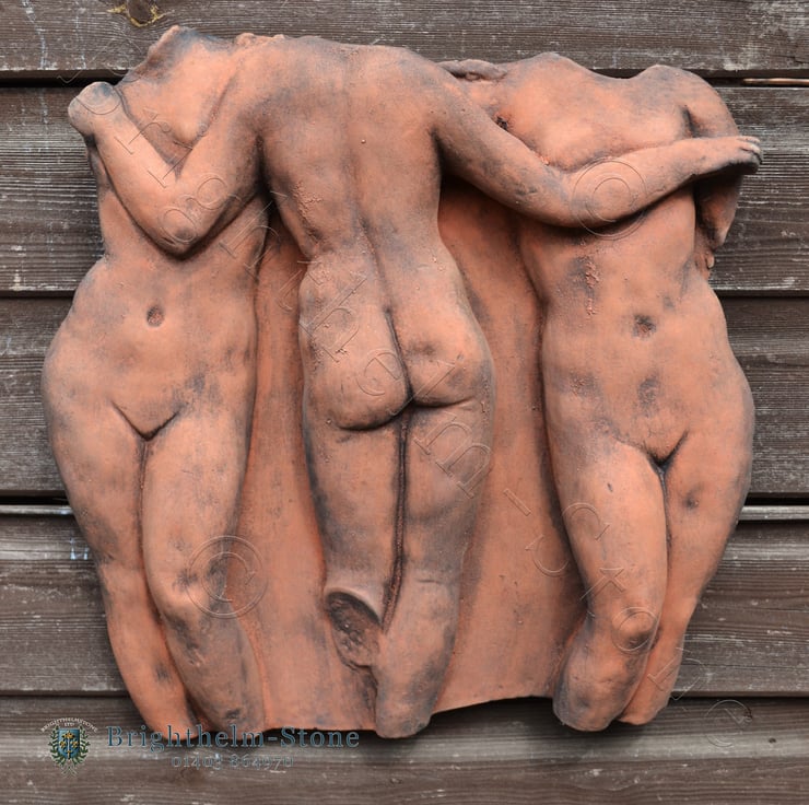 Each of our Three Graces plaques are hand cast at our Sussex workshop in frost proof reconstituted stone with an aged terracotta, white or sandstone colour finish.