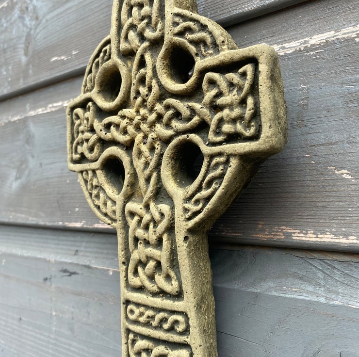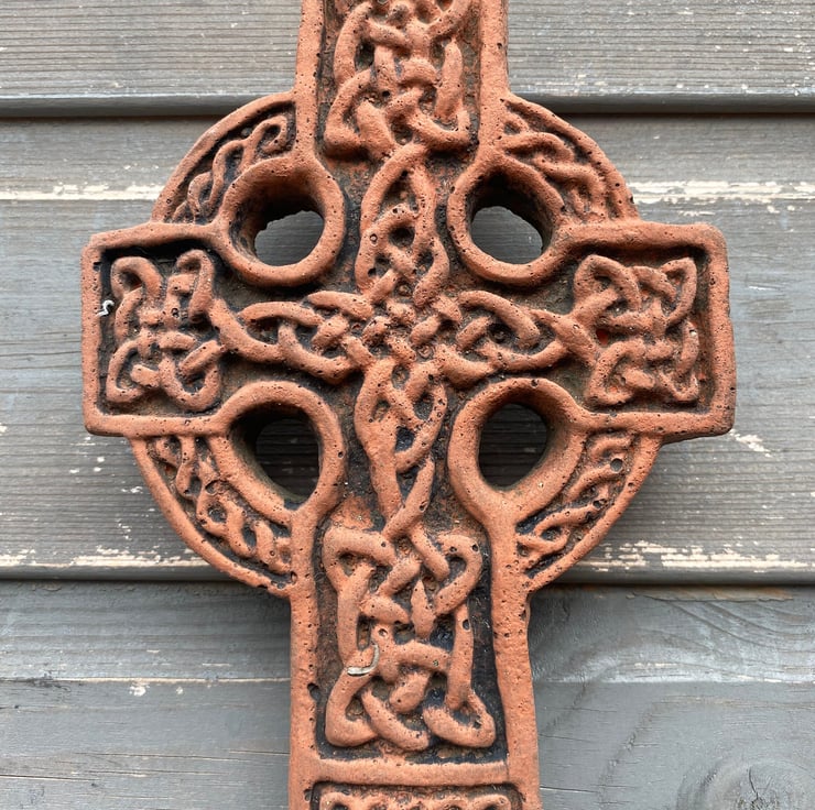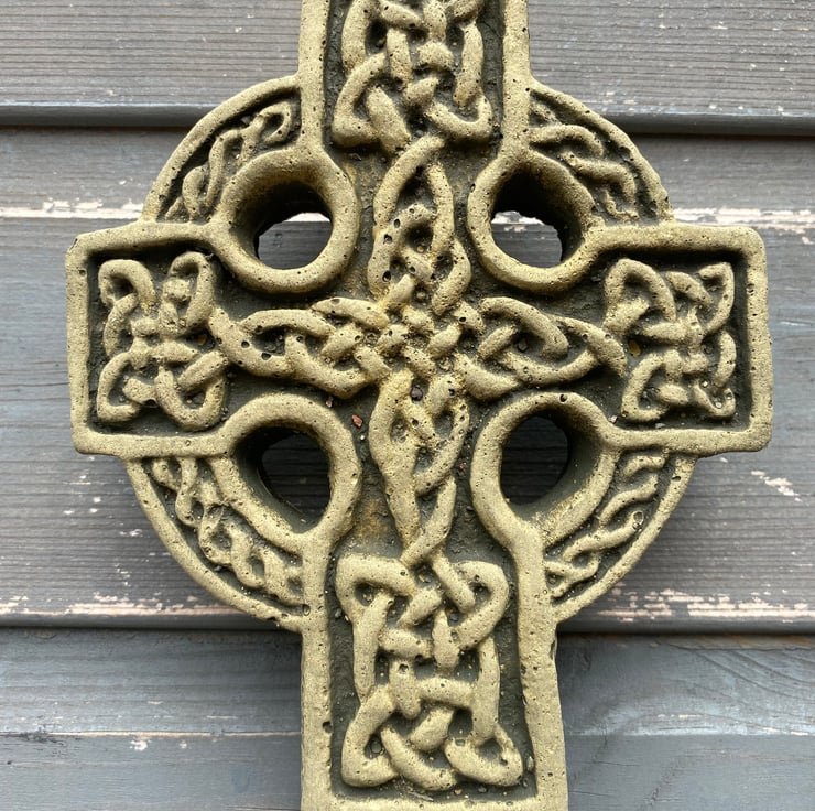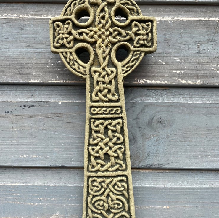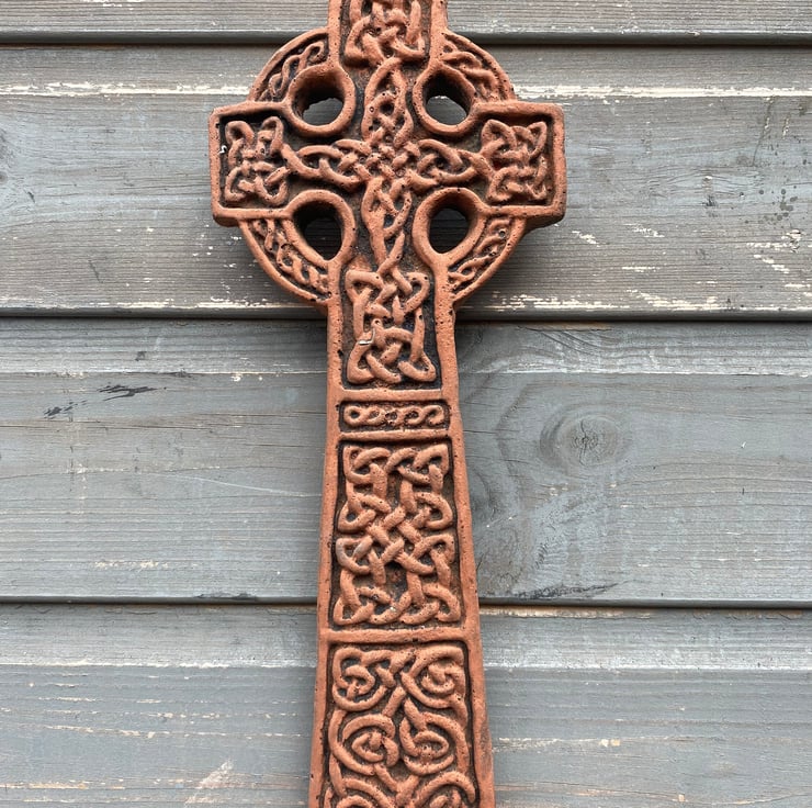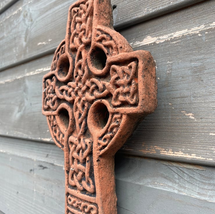 Each of our Celtic Cross plaques are hand cast at our Sussex workshop in frost proof reconstituted stone with an aged terracotta or sandstone colour finish.