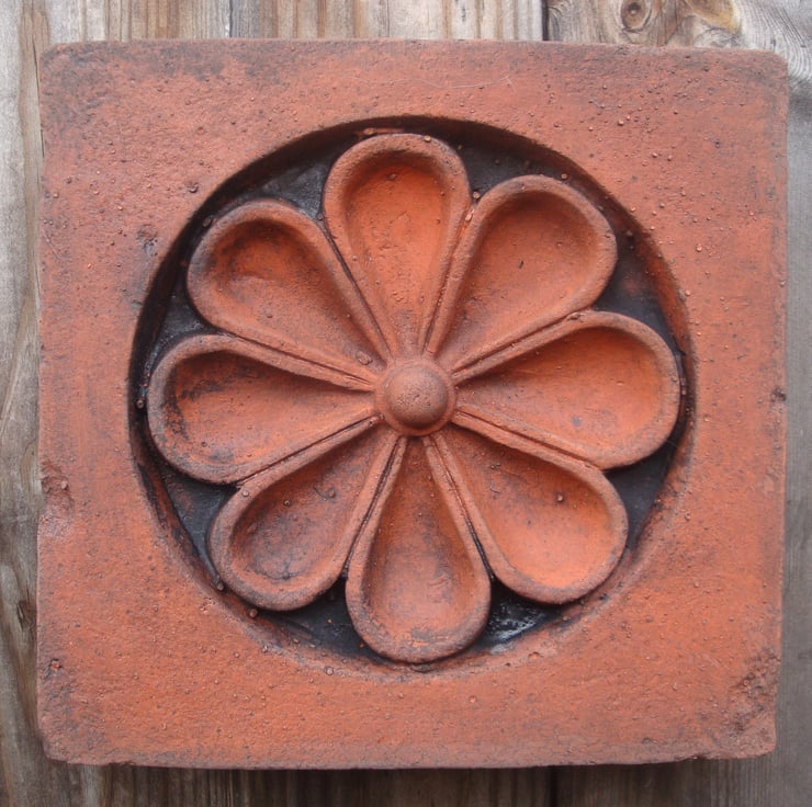 Copy of an antique decorative brick, usually found on period buildings as an architectural detail, hand cast at our workshops in Sussex in frost proof reconstituted stone in aged terracotta colour