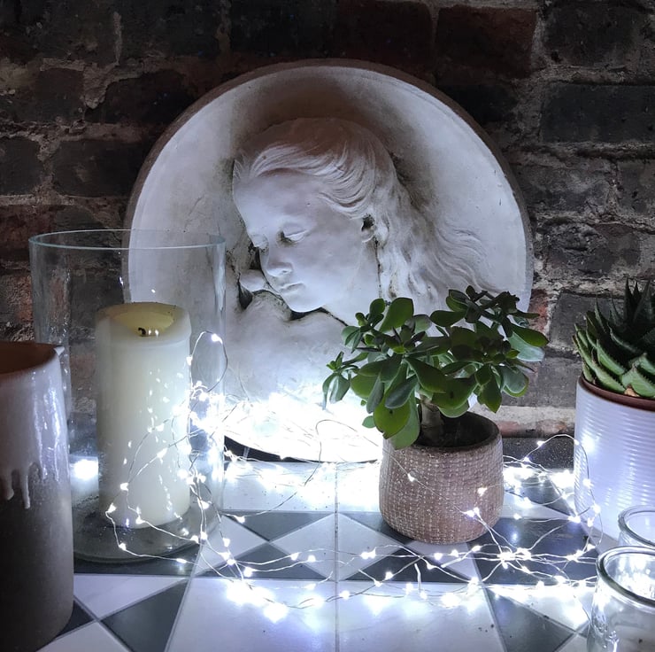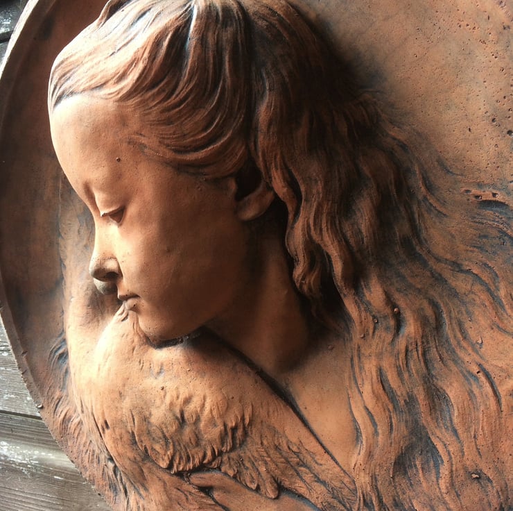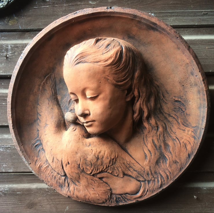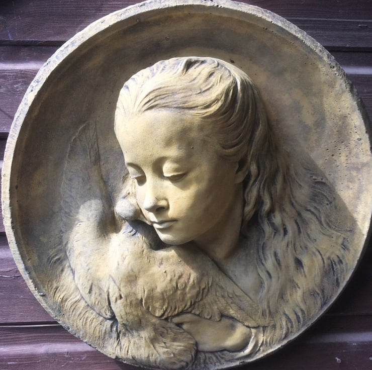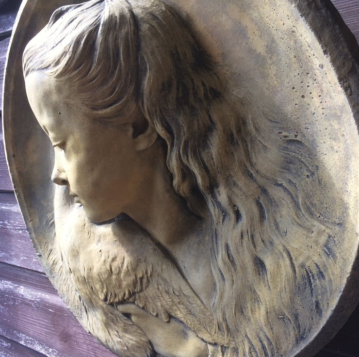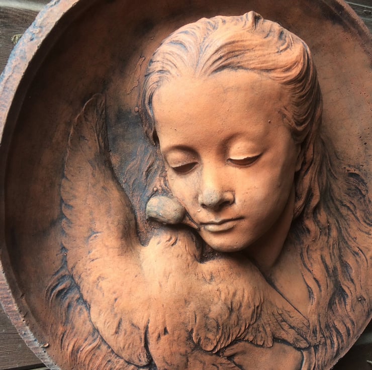 Each of our Girl and Dove wall plaques are hand cast at our Sussex workshop in frost proof reconstituted stone with an aged sandstone, terracotta or white colour finish.