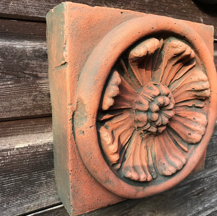 Copy of an antique decorative brick, usually found on period buildings as an architectural detail - this one comes from Ealing, London - hand cast at our workshops in Sussex in frost proof reconstituted stone in aged terracotta colour