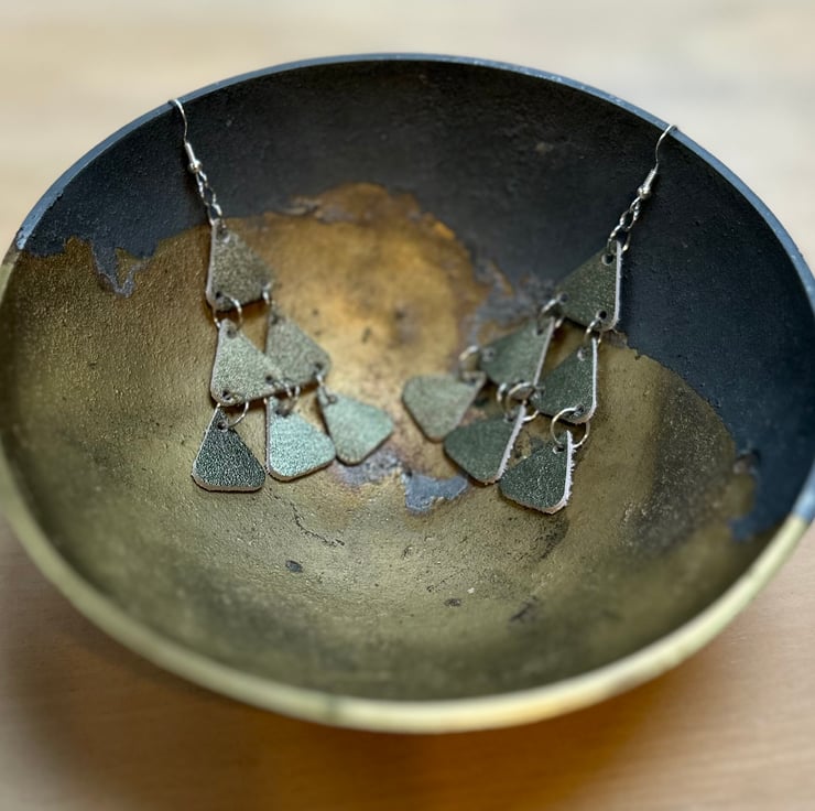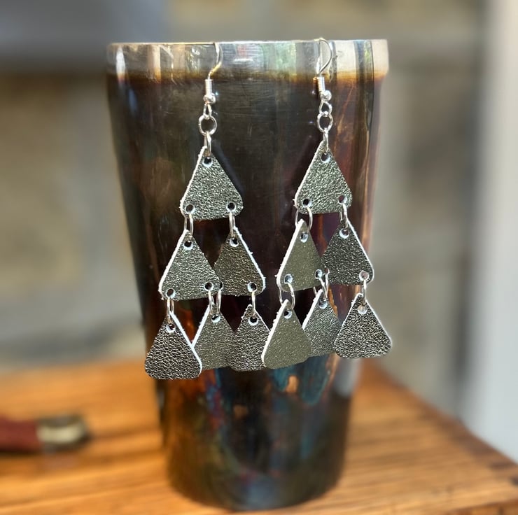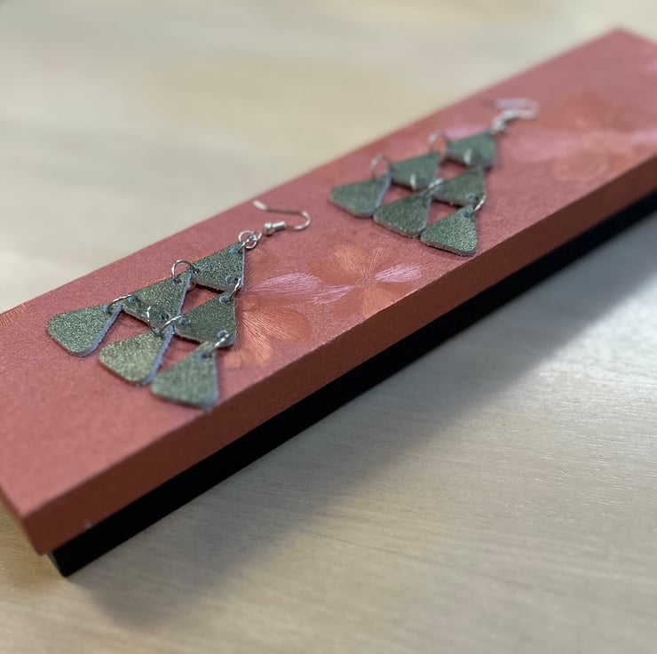 Metallic green leather chandelier earrings featuring silver metal ear wires.