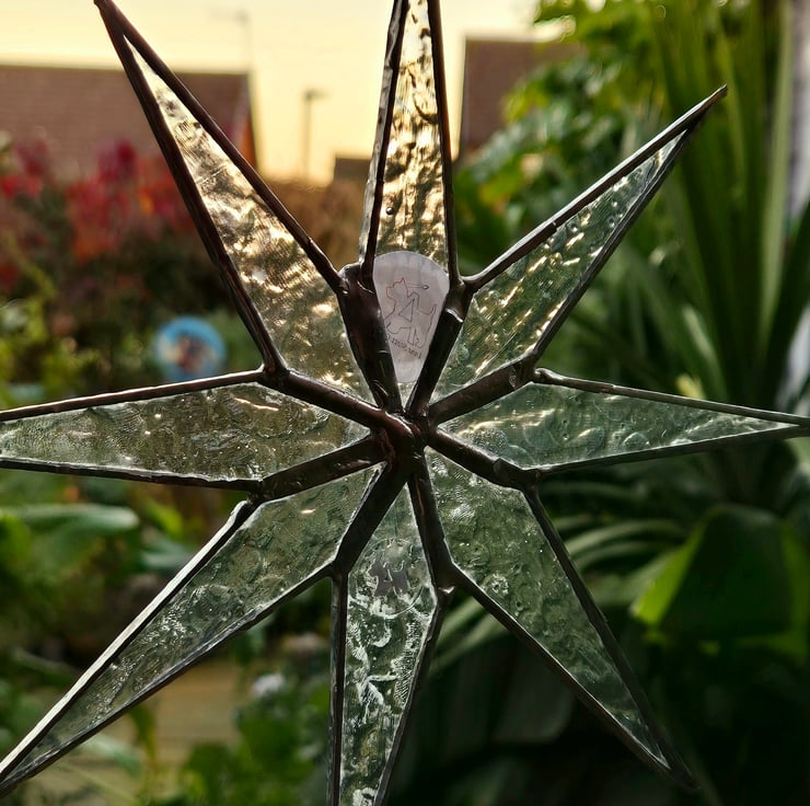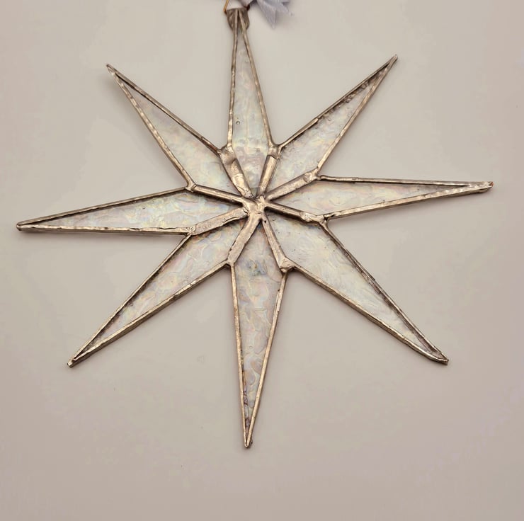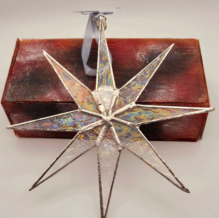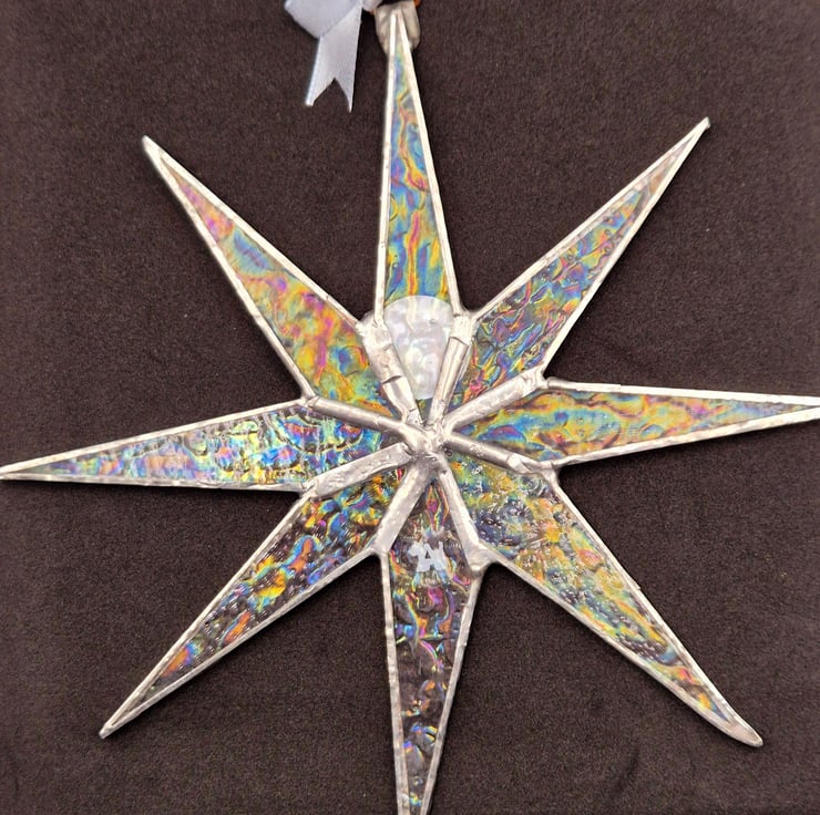 Handmade eight-pointed start made from rainbow on clear crackle iridescent glass. Copper foiled together, and silver soldered. They were finished with a silver coloured ribbon. 20cm x 20cm. The stickers on the back are removable