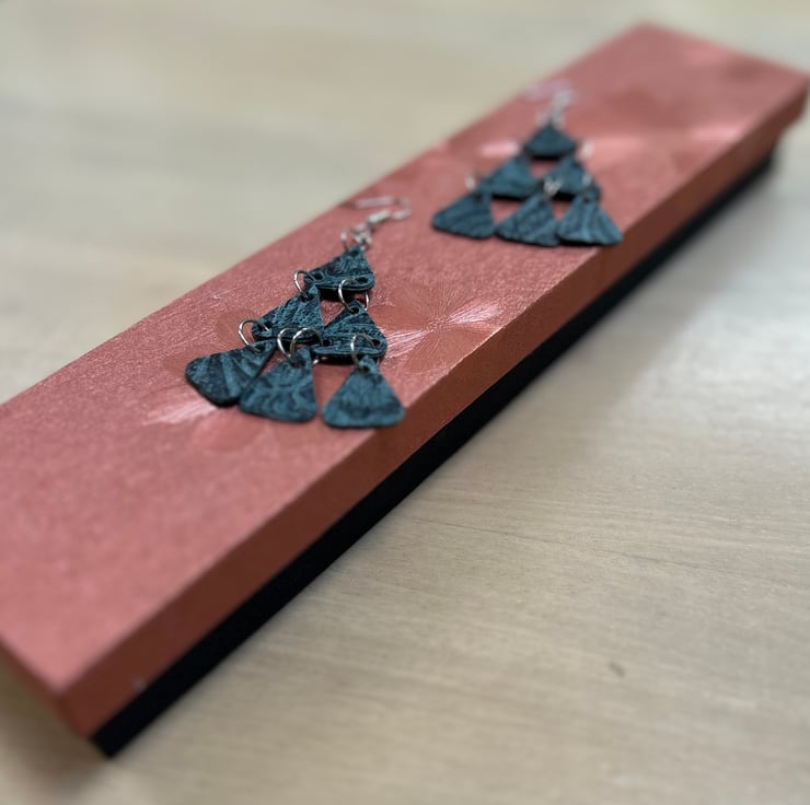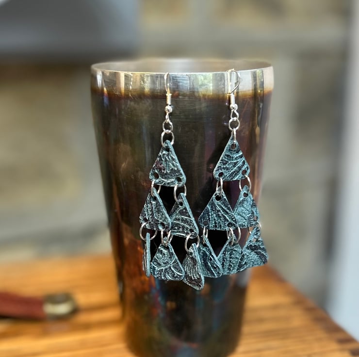 Chandelier earrings in blue paisley embossed leather (double sided) featuring silver metal ear wires.
