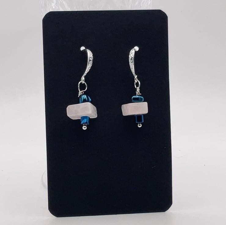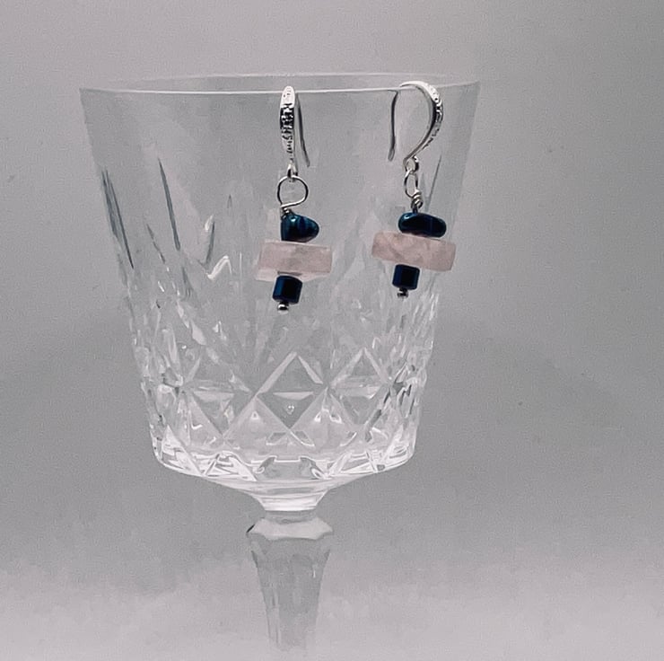 The charm of these mini earrings is in the square shape of the rose quartz and the contrast with the small sparkling midnight blue hematite beads. Perfect for someone who wears small earrings! They hang a mere 20 mm from tiny silver ear hooks. Perfect for everyday wear!