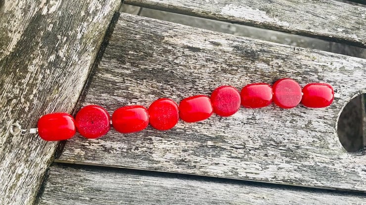Chunky red glass geometric bracelet, 7 inches plus a 0.75 inch sterling silver heart extension chain so can be worn up to 7.75inches at the largest size. Sterling silver spring ring clasp. Free gift pouch. Only two left,