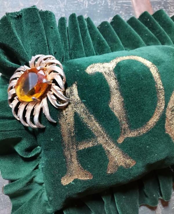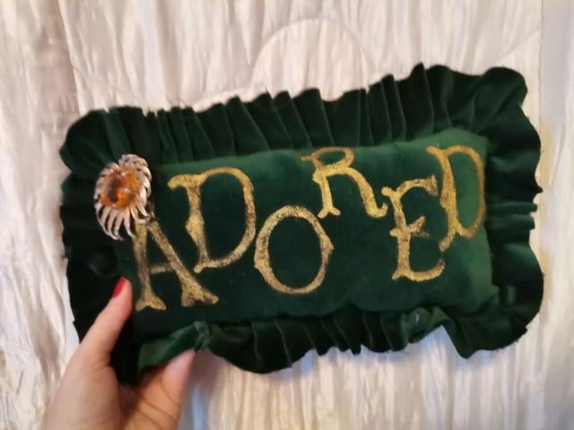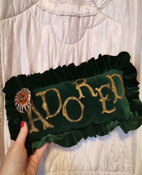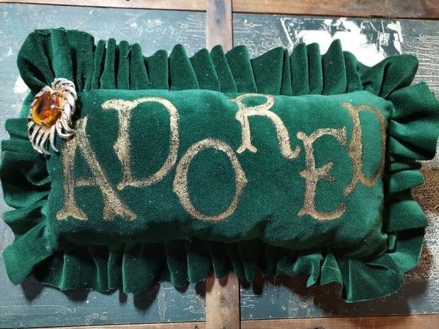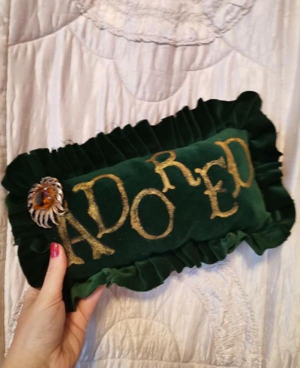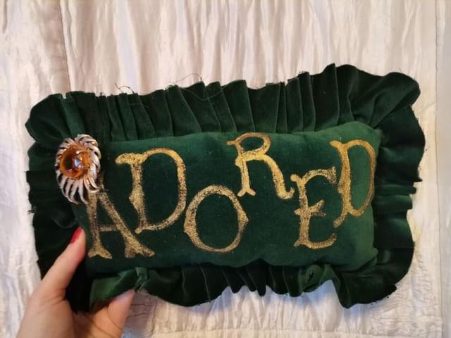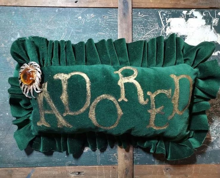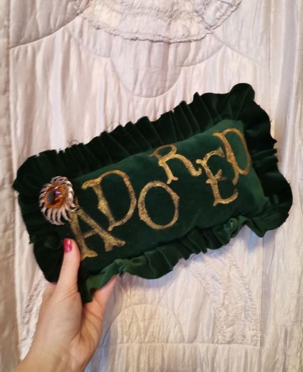 I made this piece using a gorgeous vintage style green velvet, handpainted in a burnt copper, gold paint.