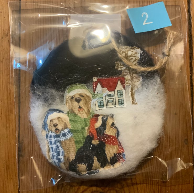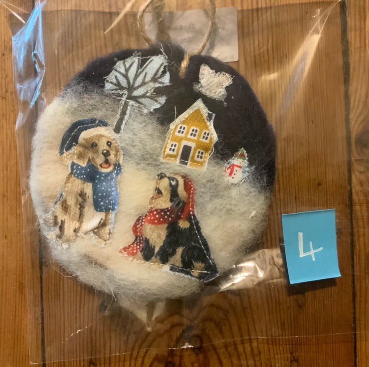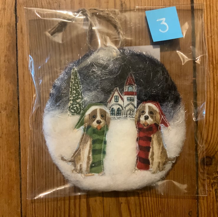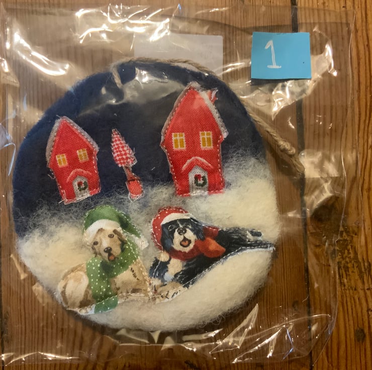 These absolutely Beautiful felted Christmas hanging decorations. Hand felted Snowy night scene with appliqué carol singing dogs.a