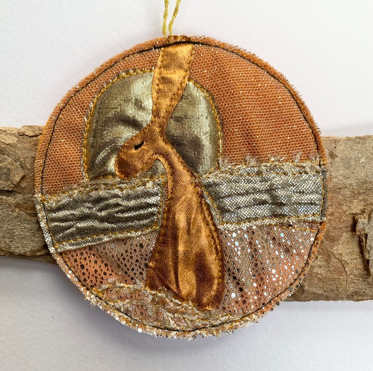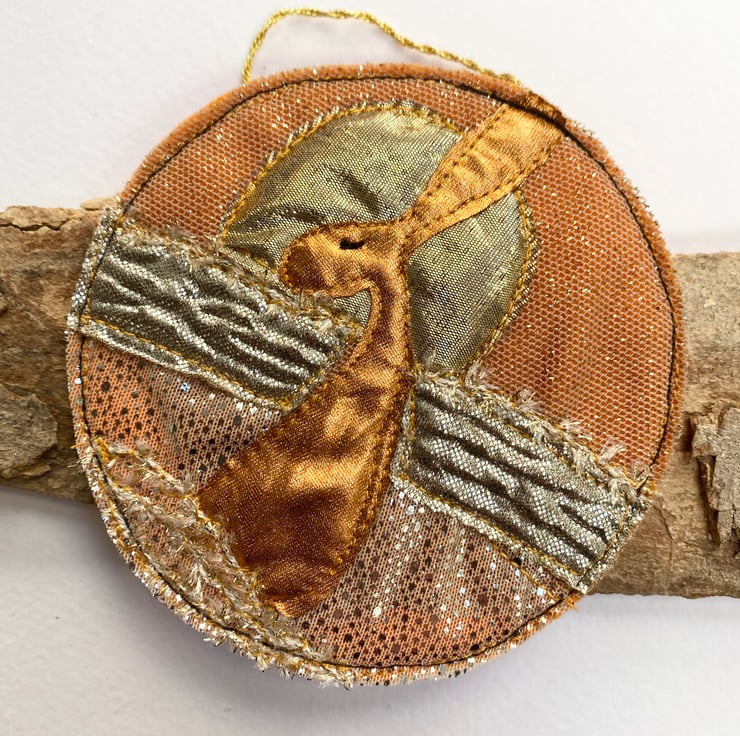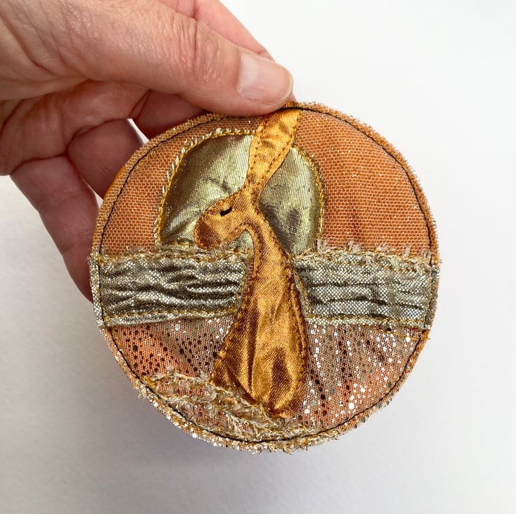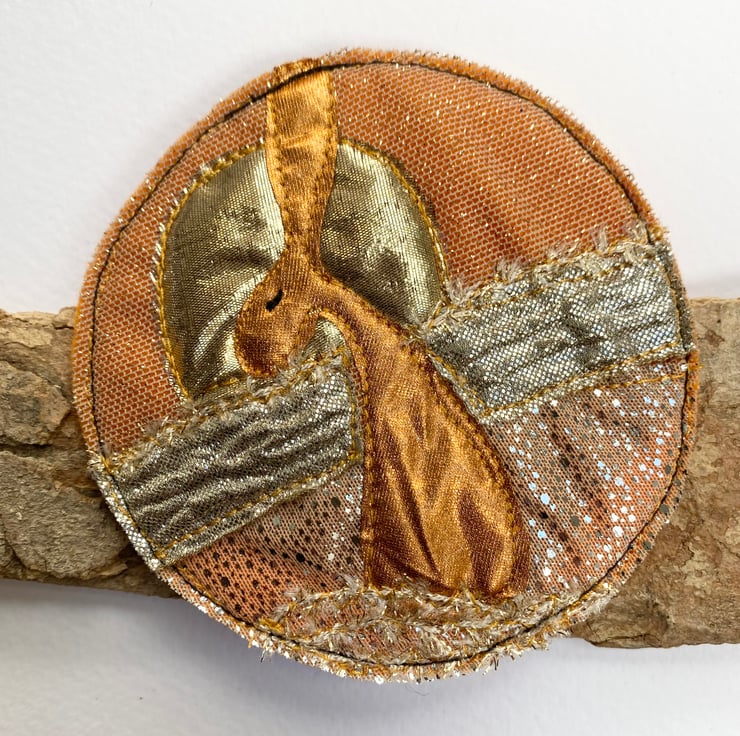 This charming embroidered hare home decorations shows a hare framed by a setting harvest sun. It has been made from up-cycled fabrics and stitched down with free motion embroidery. It comes felt backed and measure approx 9.5cm diameter, with the ribbon the length is 15.5cm.