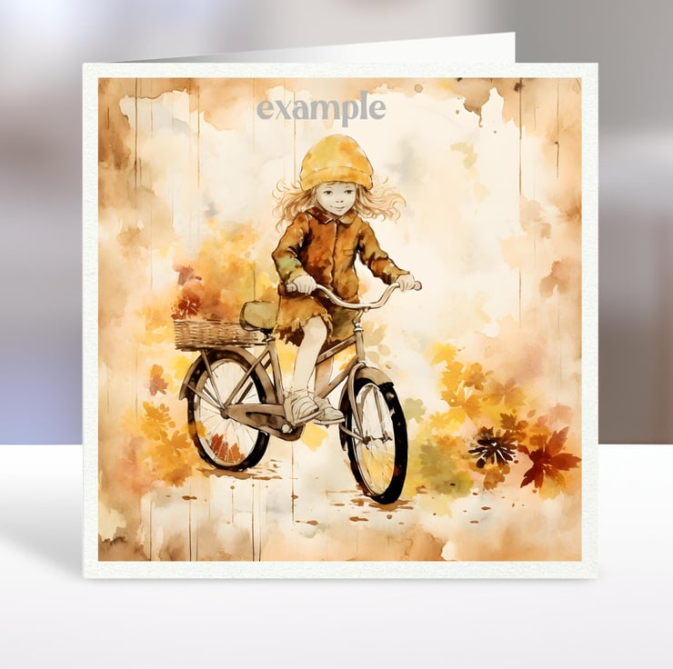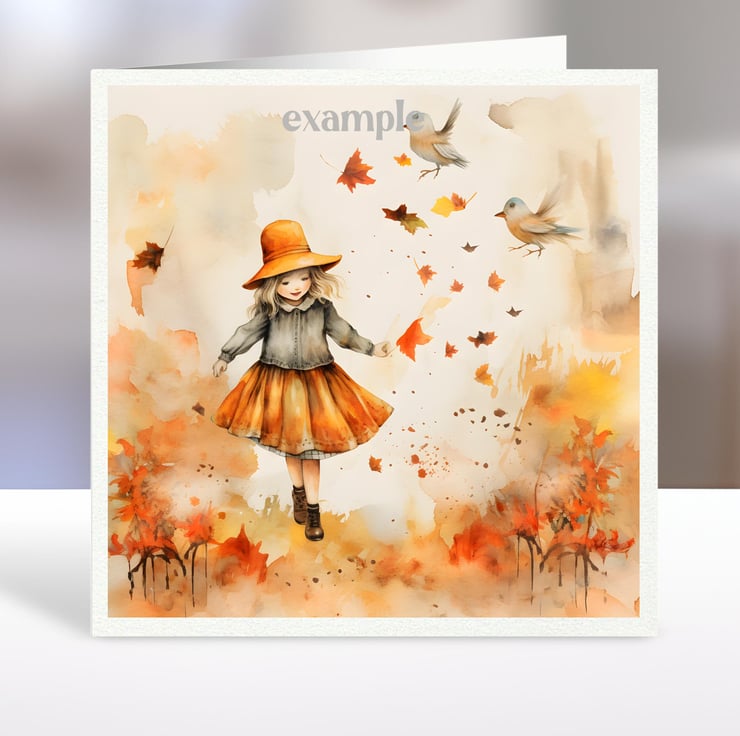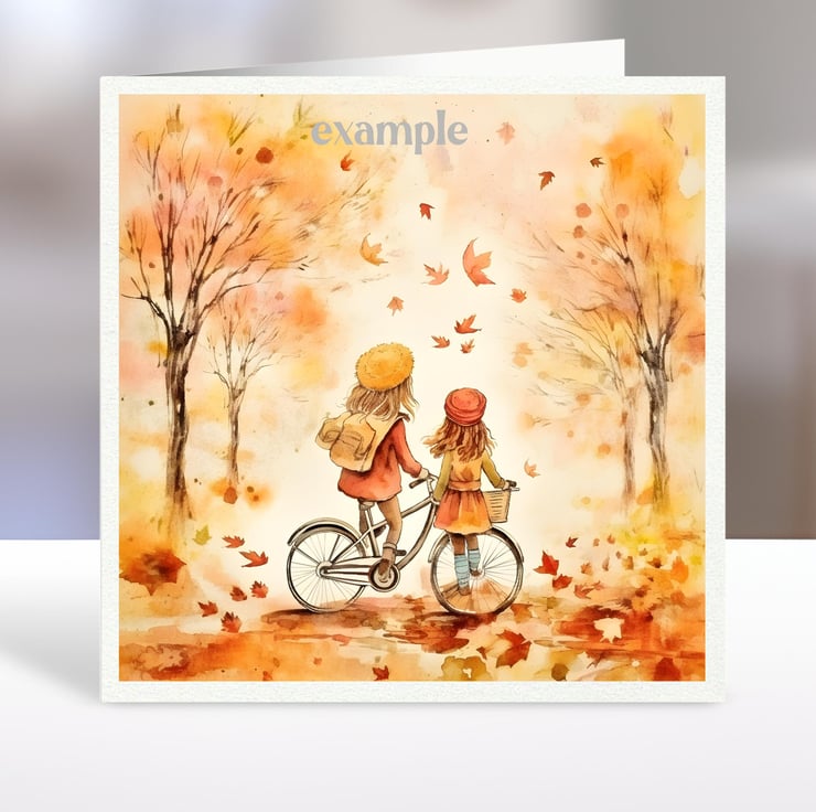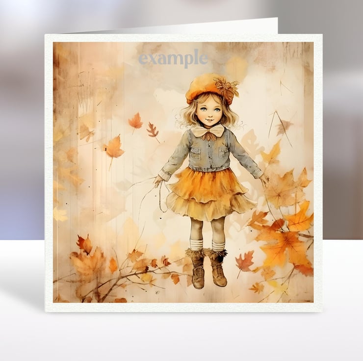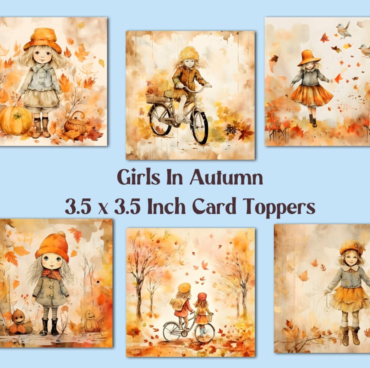 A set of six 3.5 inch square card toppers - Girls in Autumn - Girls cycling, collecting pumpkins and playing in the Autumn leaves.