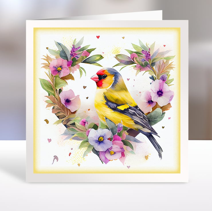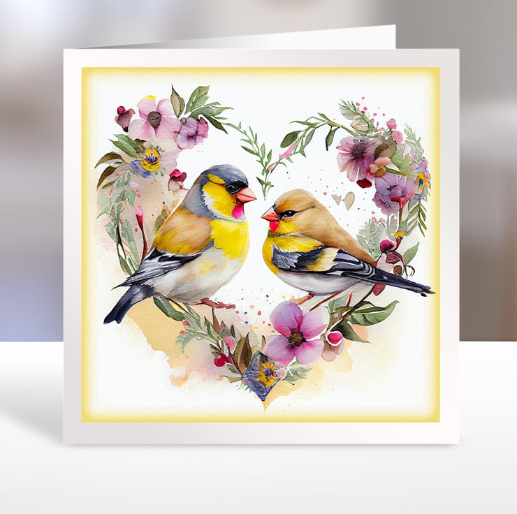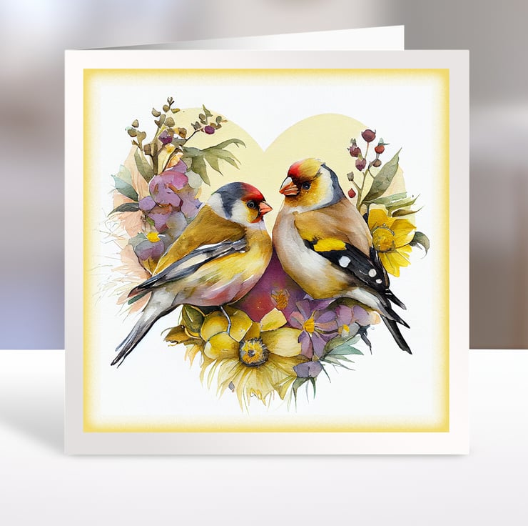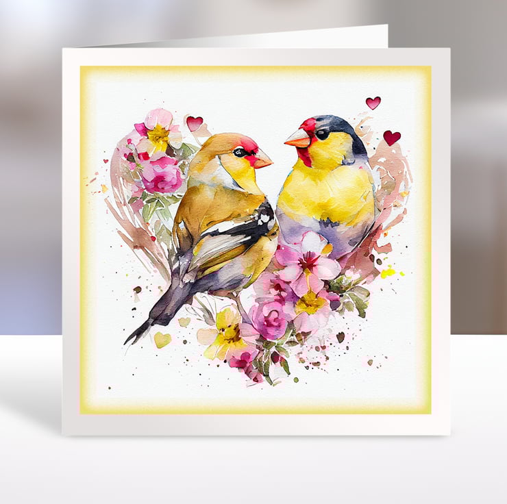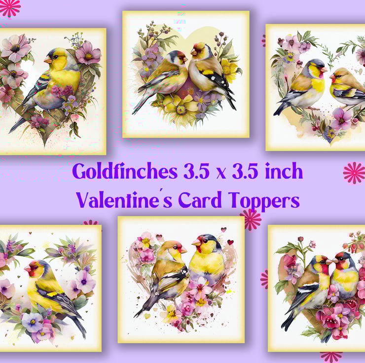 A set of six 3.5 inch square card toppers - Goldfinches with floral heart shaped backgrounds, ideal for Valentine's day cards etc.