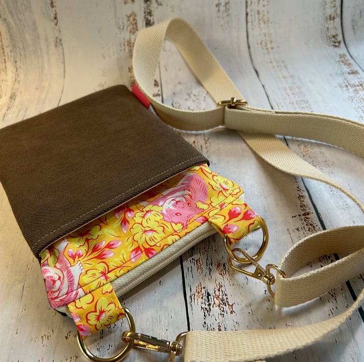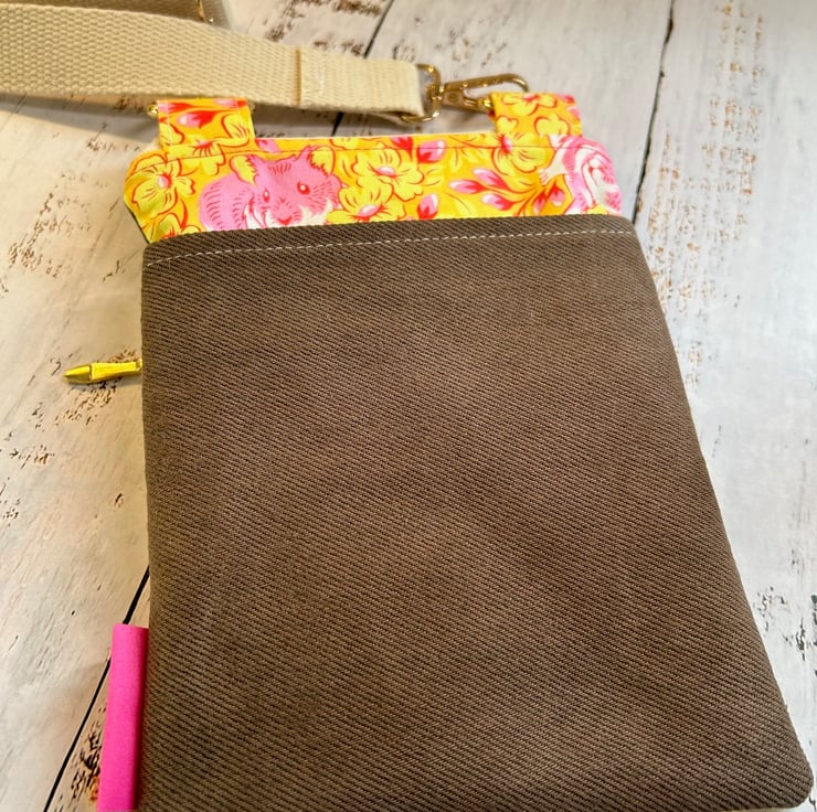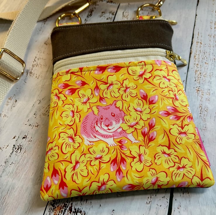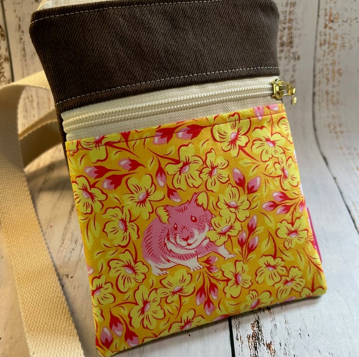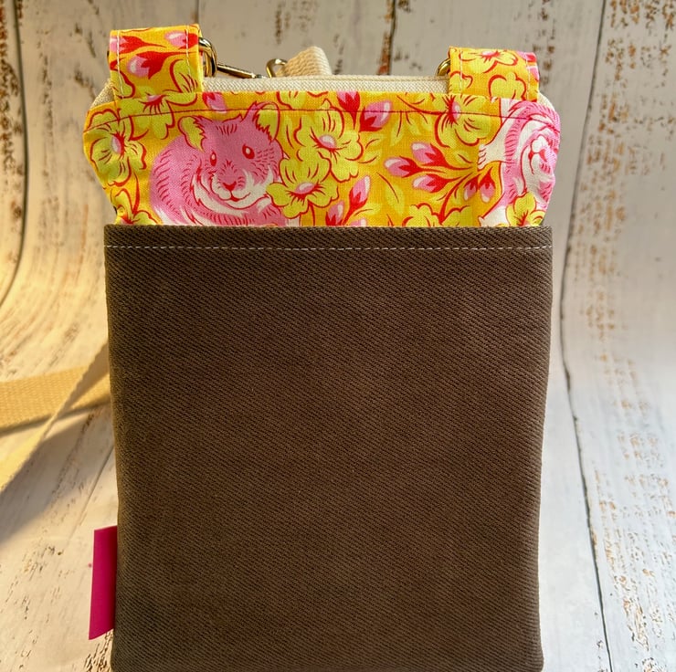 This is truly a one off bag, as the brown denim is upcycled from a pair of Levi jeans! The co-ordinating fabric is a quirky yellow and pink print detailed with hamsters, 100% cotton by designer Tula Pink.