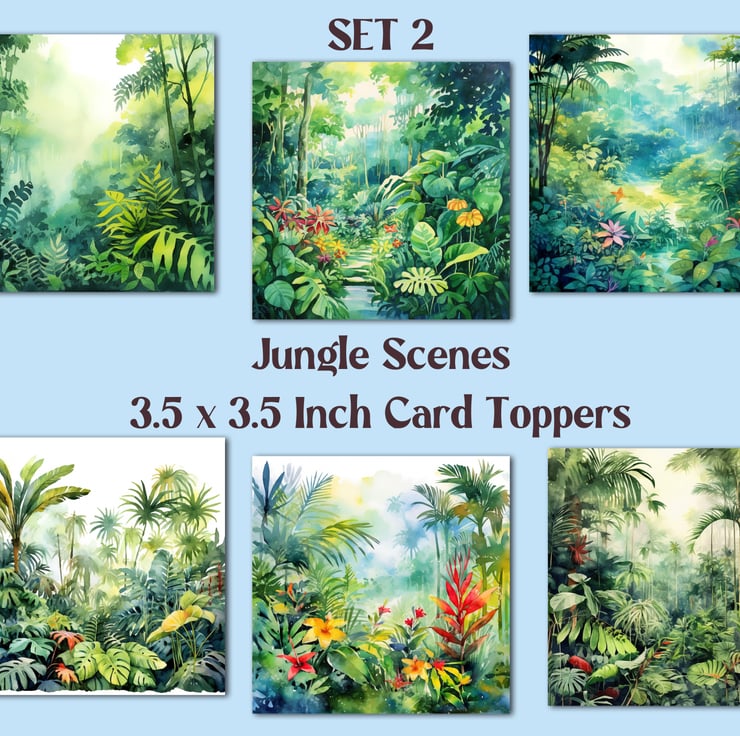 A set of six 3.5 inch square card toppers - Jungle Scenes - Set 2 of 2