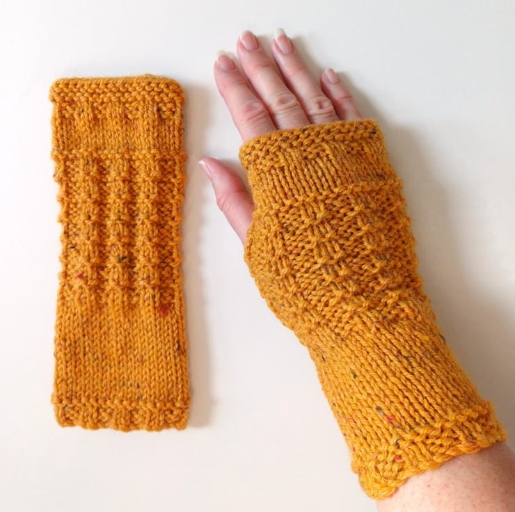 These deep heather pink tweed soft fingerless mittens / wrist warmers / gloves are knitted with a pretty waffle pattern. They are made from 25% Aran tweed wool with little flecks of turquoise and black and are 8 inches long.