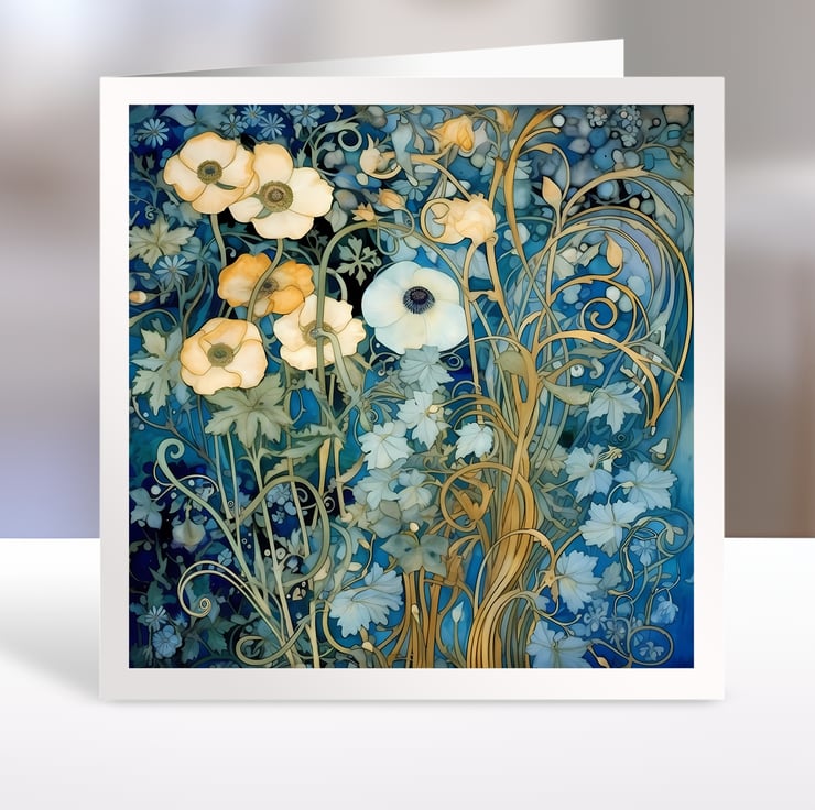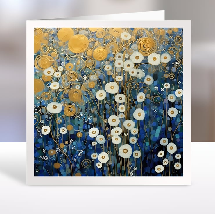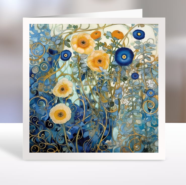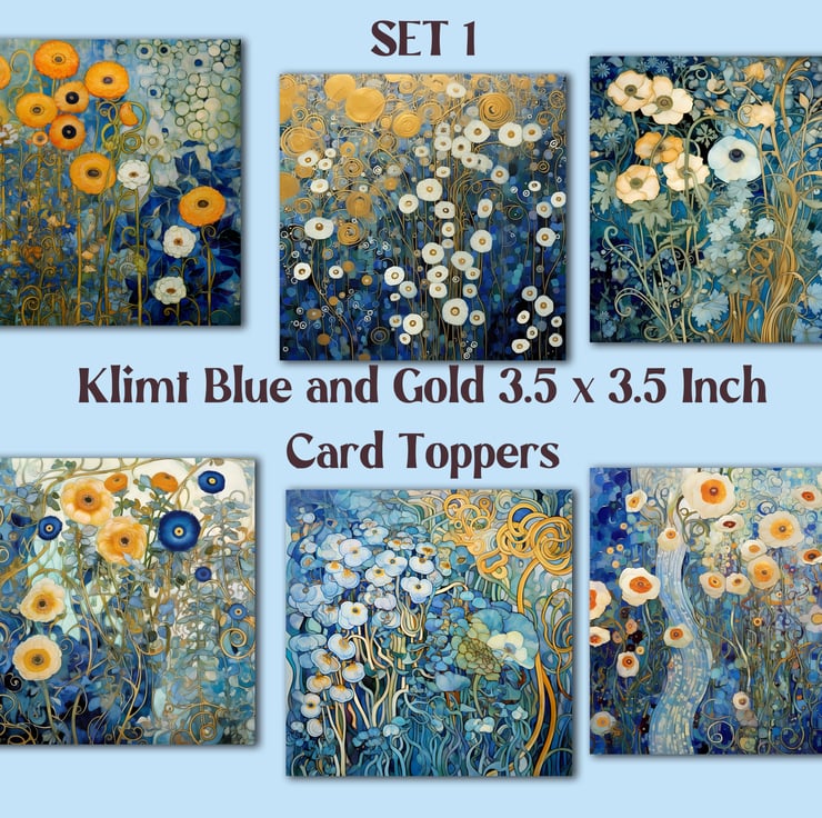 A set of six 3.5 inch square card toppers - Klimt Blue Gold - Set 1 of 2 - Klimt style card toppers in blue and gold