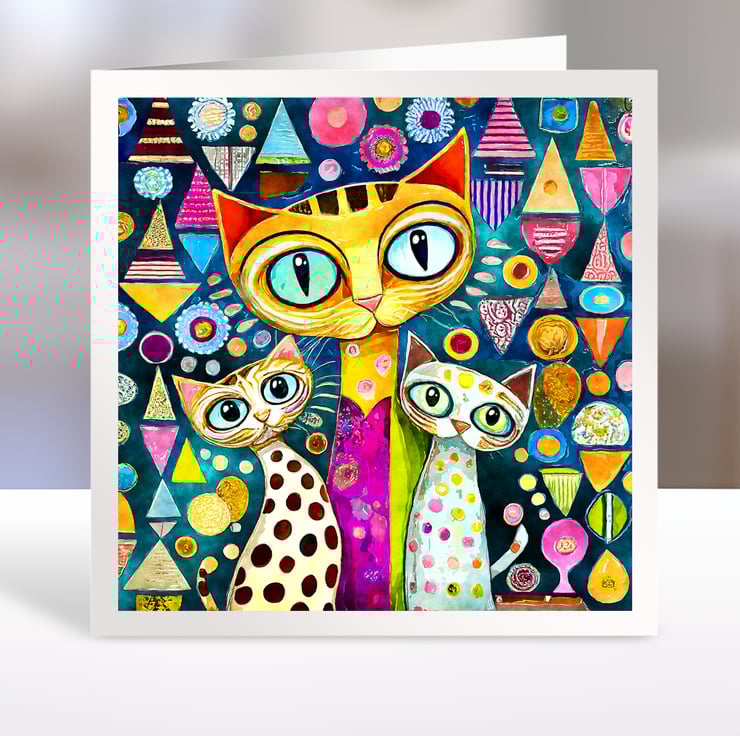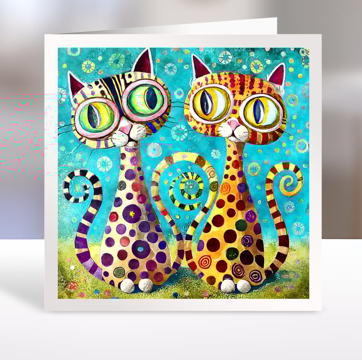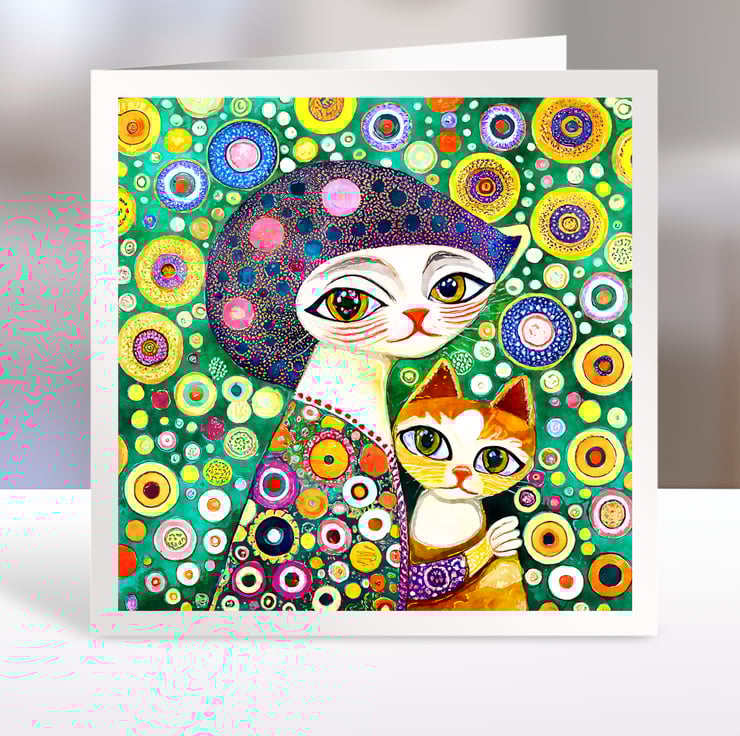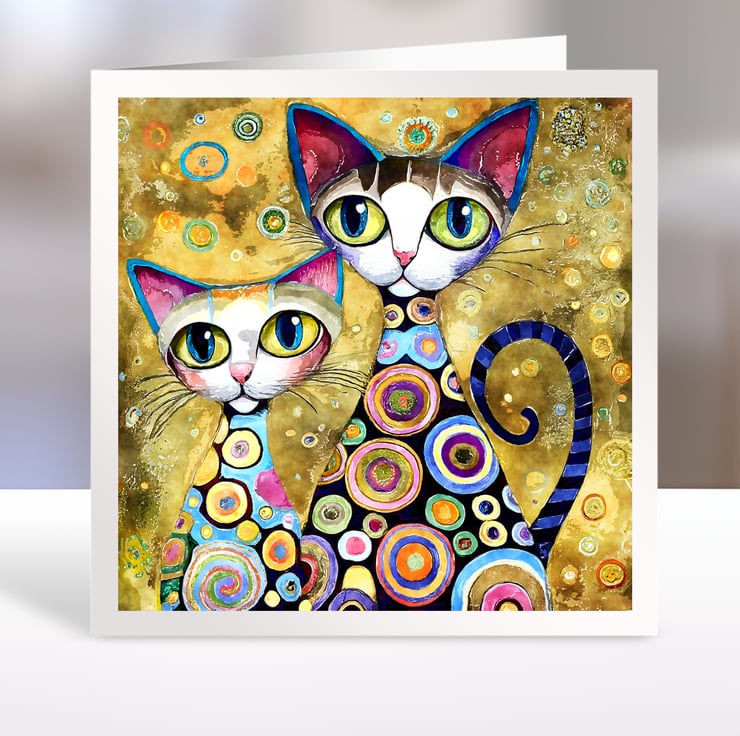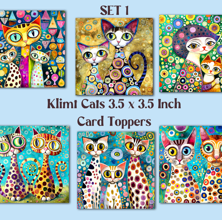 A set of six 3.5 inch square card toppers - Klimt Cats - Set 1 of 2 - Klimt style card toppers with cats