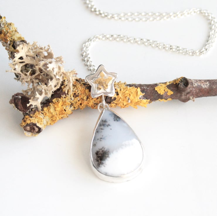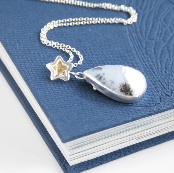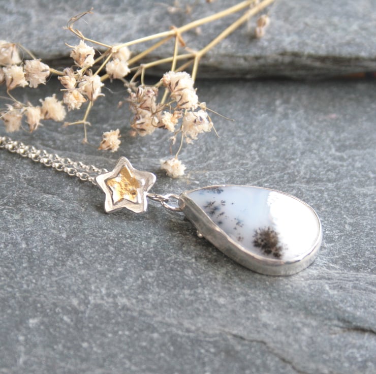 This beautiful dendrite opal gemstone necklace is created from a teardrop gemstone set in recycled sterling silver with a silver and 24 ct gold foil star. The gold is applied to the silver using the ancient technique of Keum Boo.