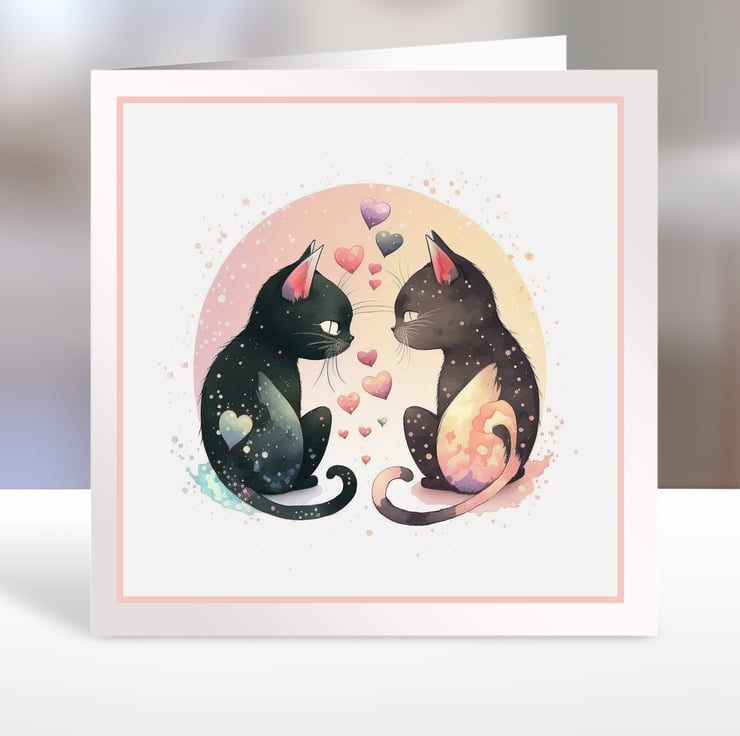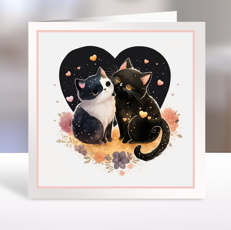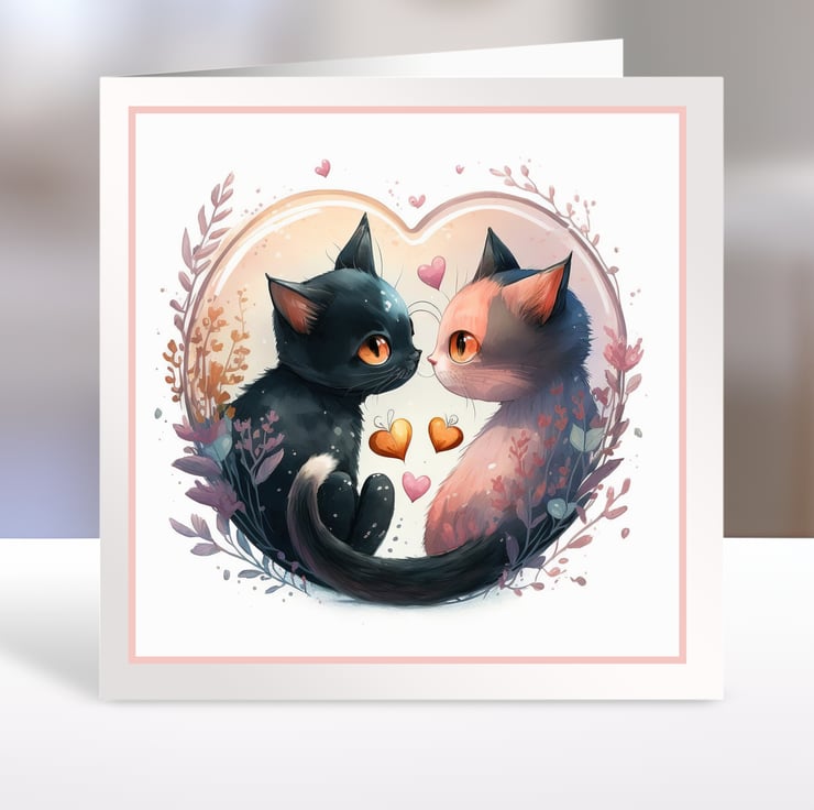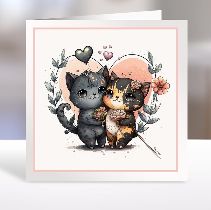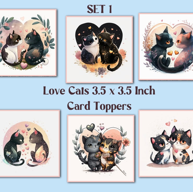 A set of six 3.5 inch square card toppers - Love cats - Set 1 of 2 - ideal for Valentine's Day cards.