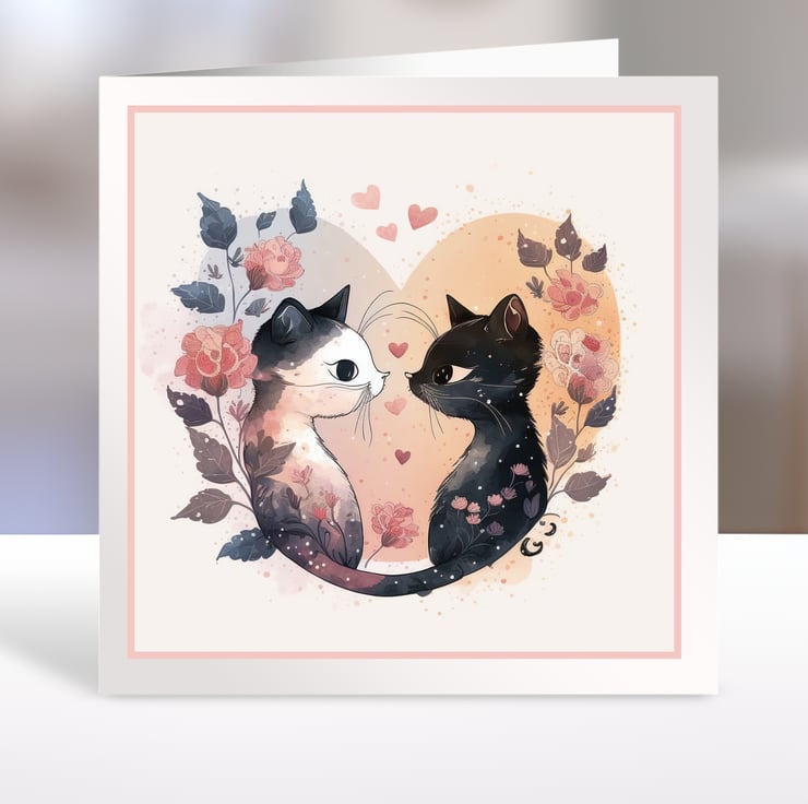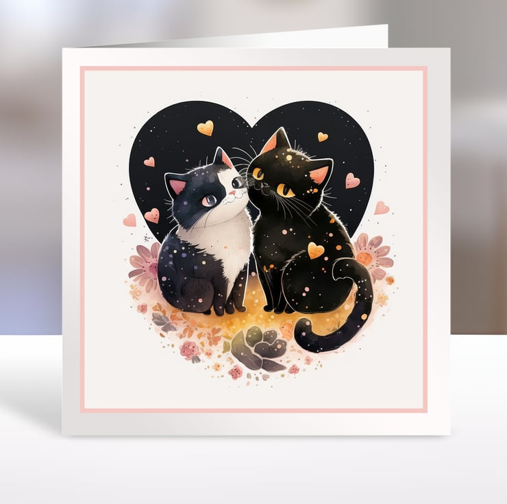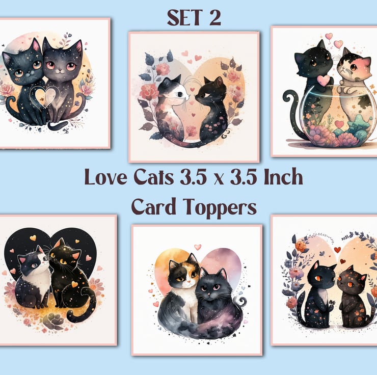 A set of six 3.5 inch square card toppers - Love cats - Set 2 of 2 - ideal for Valentine's Day cards.