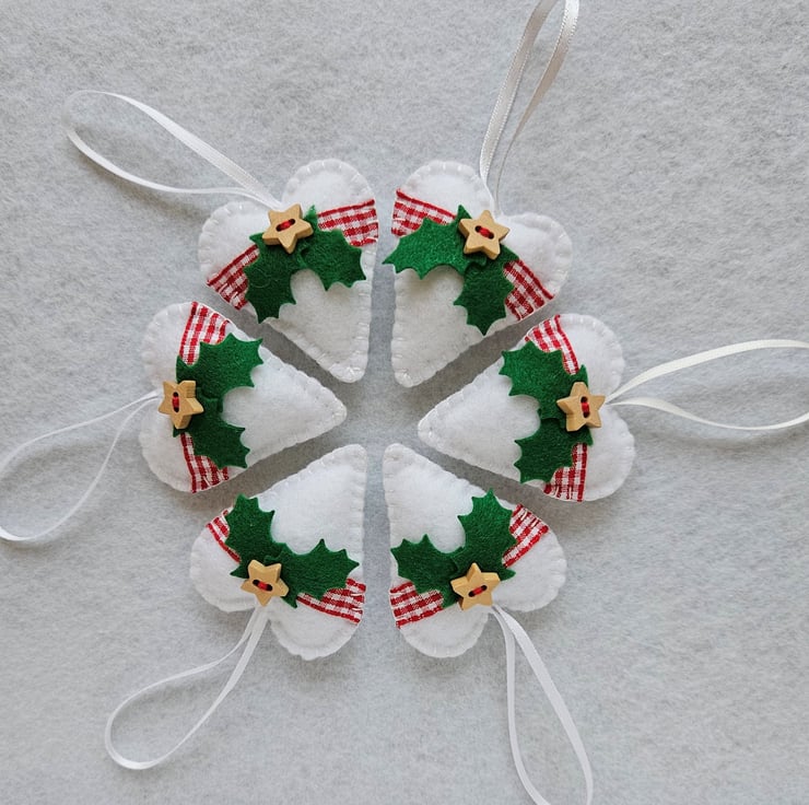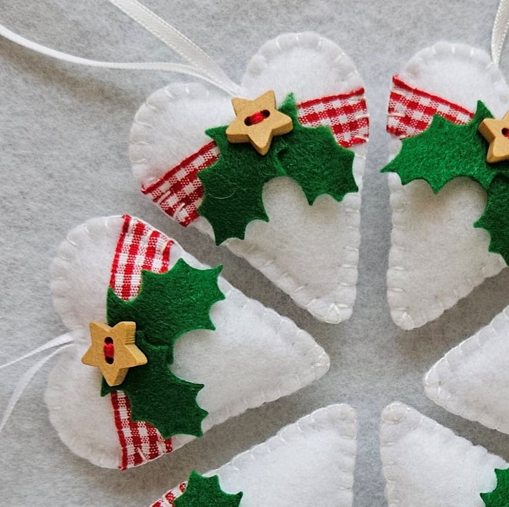 The perfect addition to your Christmas decorations. Cut from soft white felt, this heart has been hand stitched and decorated with red gingham ribbon, cut felt holly leaves and a wooden star button. White ribbon hanging loop.