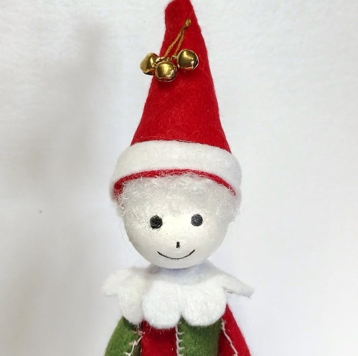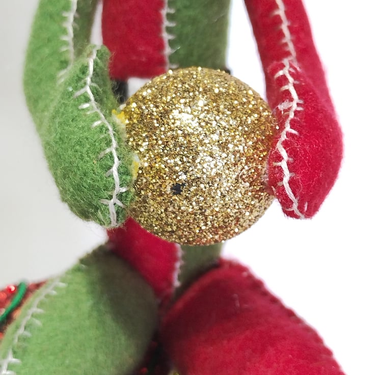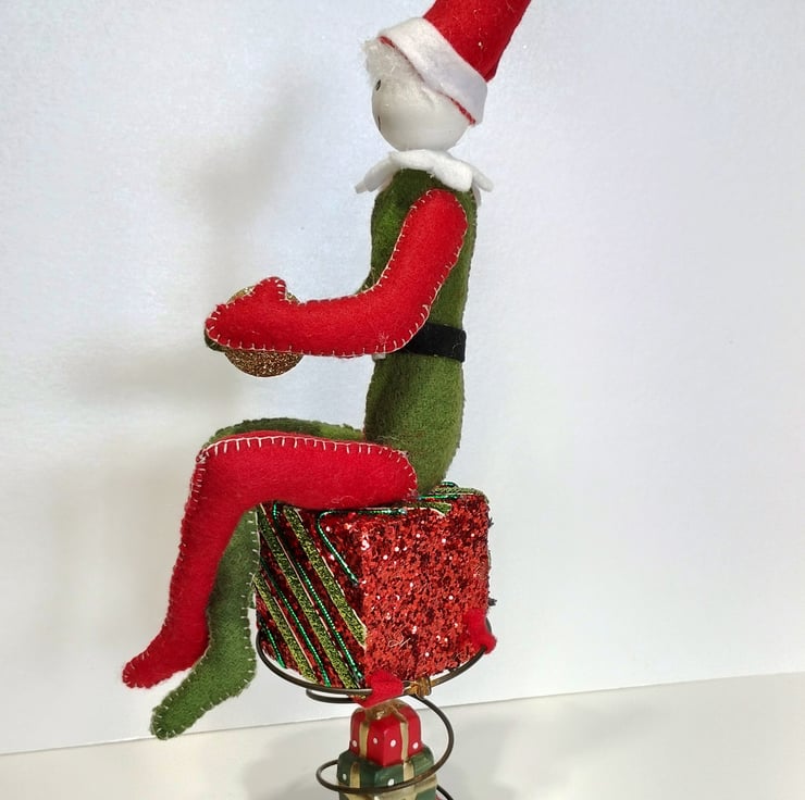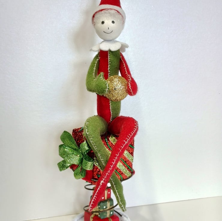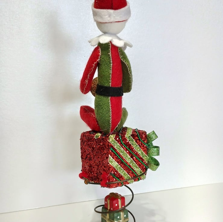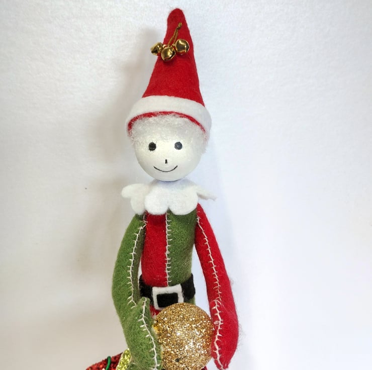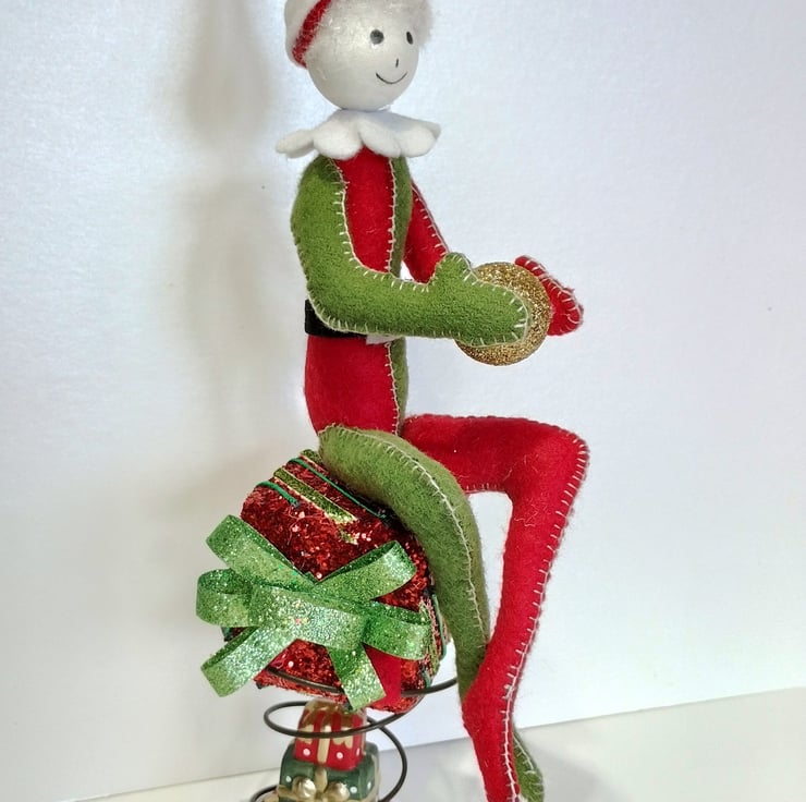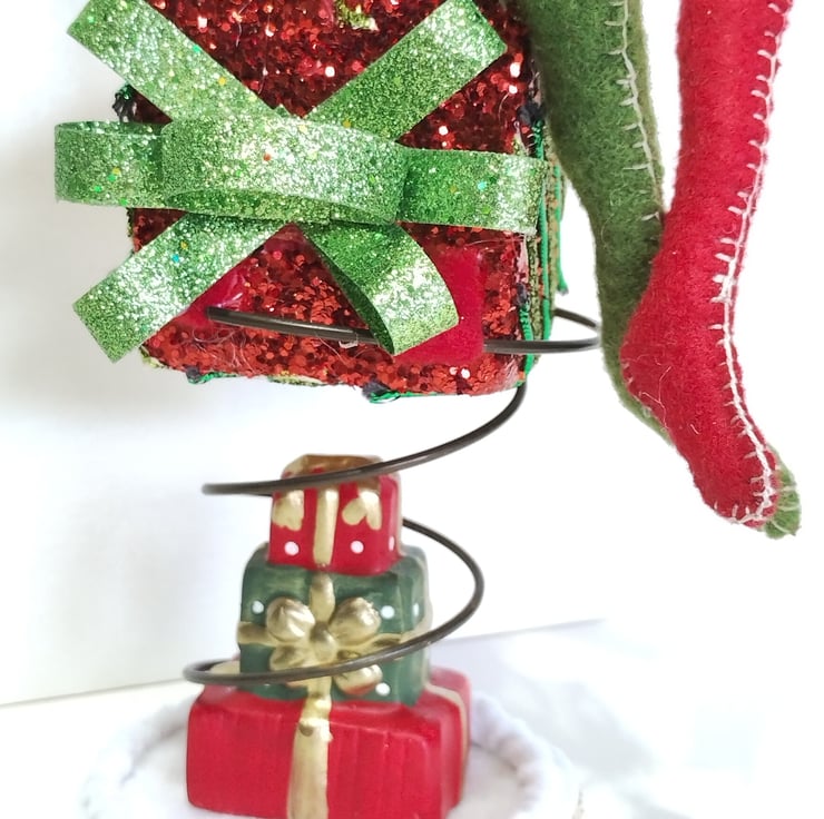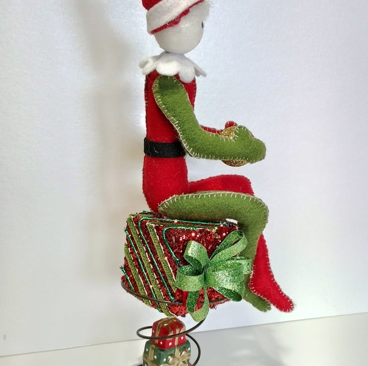 She's called "The Christmas Gift Keeper" because she has gathered together some Christmas gifts, making sure that those naughty elf's on the shelf don't hide them. Sitting on top of a large red glittering gift and large green bow, holding a gold glittery ball, and with more gifts underneath her that are made with crafters clay. She's wearing her own felt designer outfit with a matching red and white felt hat which has three little gold jingling bells. Attached to one my vintage bedsprings which in turn sits on a birch wood cut-off that I've covered with white felt. She will 'wobble' if you gently touch her, which gives her an even more special look. Using a wooden ball for her head, her red and green felted body, which is filled with UK-approved toy stuffing, with both her eyes and mouth being drawn using Micro Fineliner Art pens. The gold glitter ball she holds and the gift she sits on are microfibre filled, the red and green glitter ribbon with the big green bow are all made using crafters paper. There is a bamboo crafters dowel inside to keep her sitting up, and this will also let you gently move her a little bit should she need repositioning. A beautiful Christmas Gift. Ready for posting now.