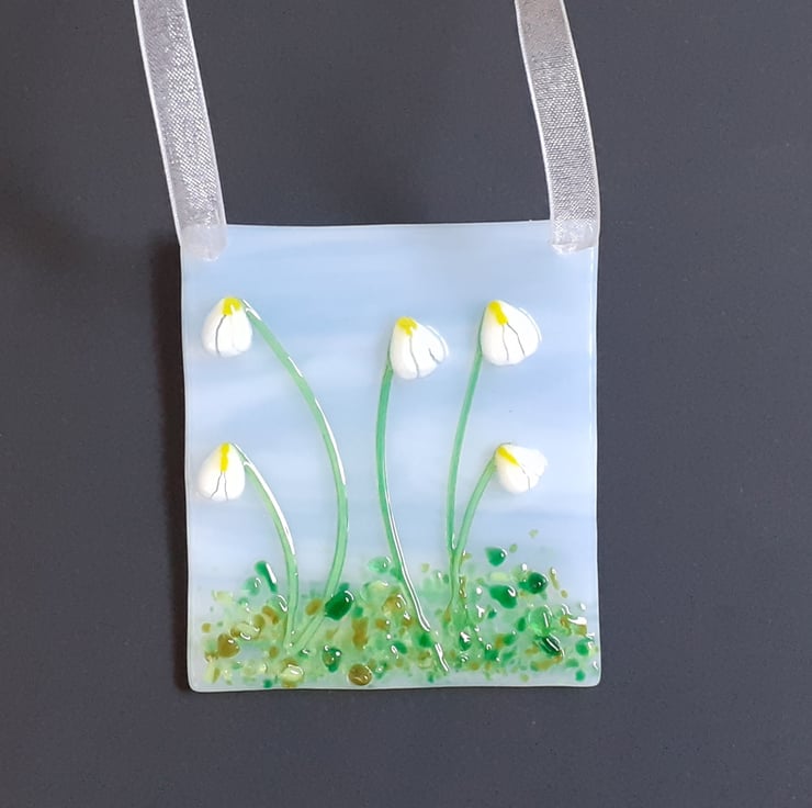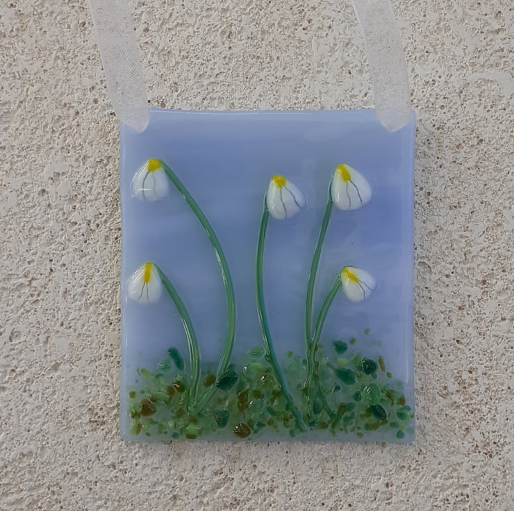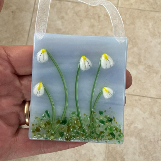 Fused glass miniature hanging decoration depicting delicate white flowers, which would make a lovely little keepsake gift.