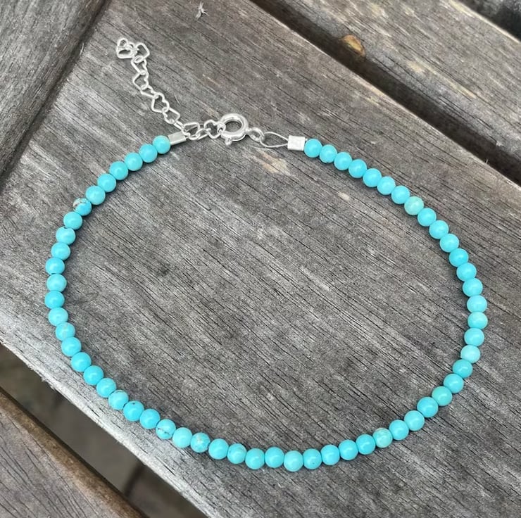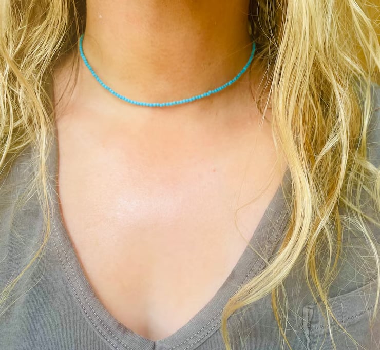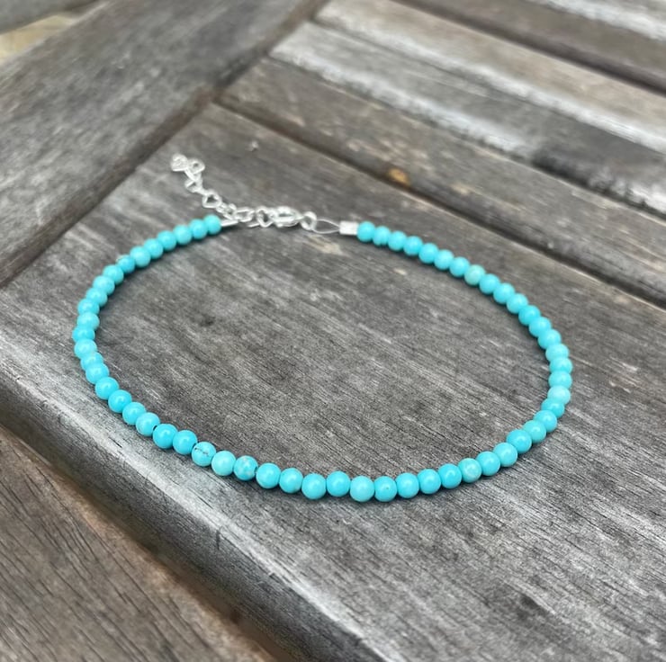Tiny turquoise gemstone beads, approx 3mm in size choker necklace or longer necklace . This turquoise beaded choker necklace is 14. inches in length, end to end, including the clasp, with a sterling silver clasp and sterling silver hearts extension chain. . The extension chain is 2 inches in length, so 16 inches at the largest fastening . 18inch plus the 2 inch extension