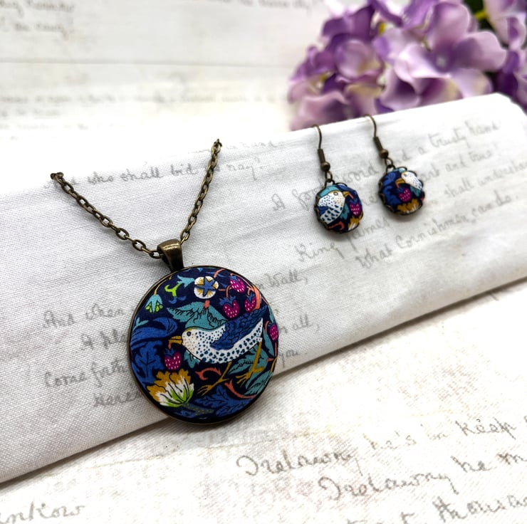 Strawberry Thief - William Morris’ most famous design! This fabric button jewellery set would suit any Arts and Crafts fan!