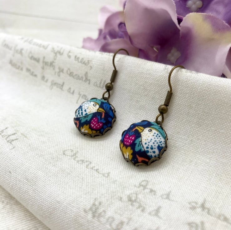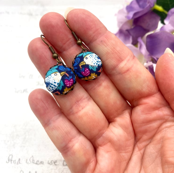 This fabric features a naughty Thrush stealing a strawberry. The blue tinted thrush stands on a dark blue background, surrounded by foliage and flowers in blues and greens with deep pink strawberries. I created a 38mm diameter fabric covered flat backed button for the pendant (choose bird facing left or right) and small 15mm buttons for the earrings showing the cheeky thrush with its strawberry (birds mirrored).