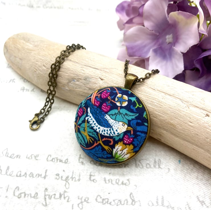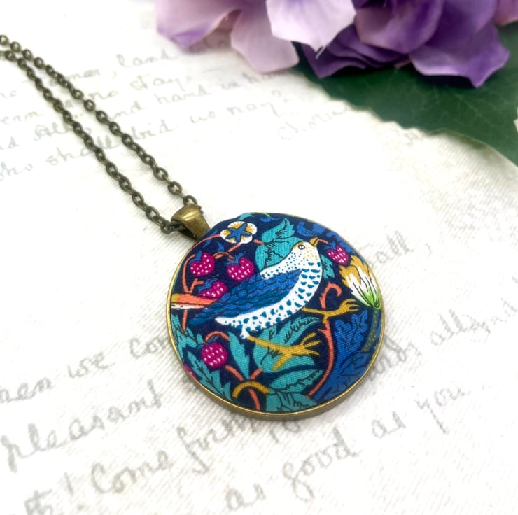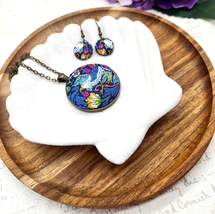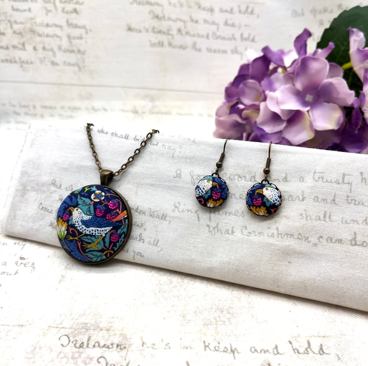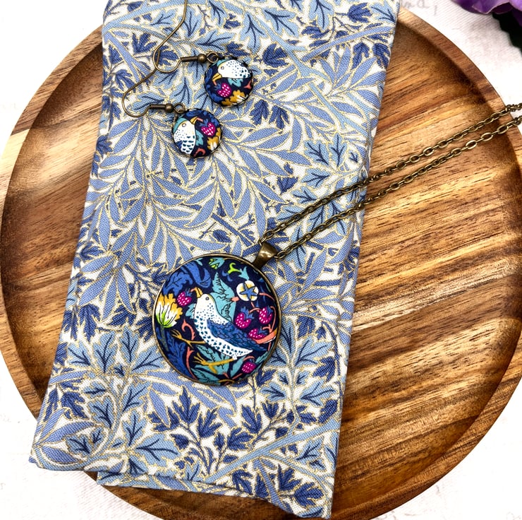 Strawberry Thief - William Morris’ most famous design! This fabric button jewellery set would suit any Arts and Crafts fan!