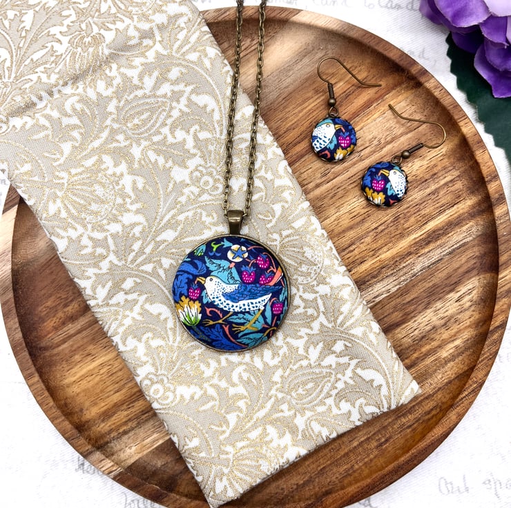 Designed by Morris himself and produced in 1883 - Strawberry thief – is one of William Morris’ most iconic designs. This jewellery set is made with gorgeous Liberty of London Tana Lawn fine cotton fabric.