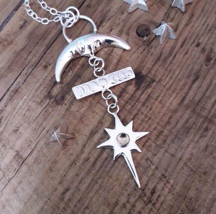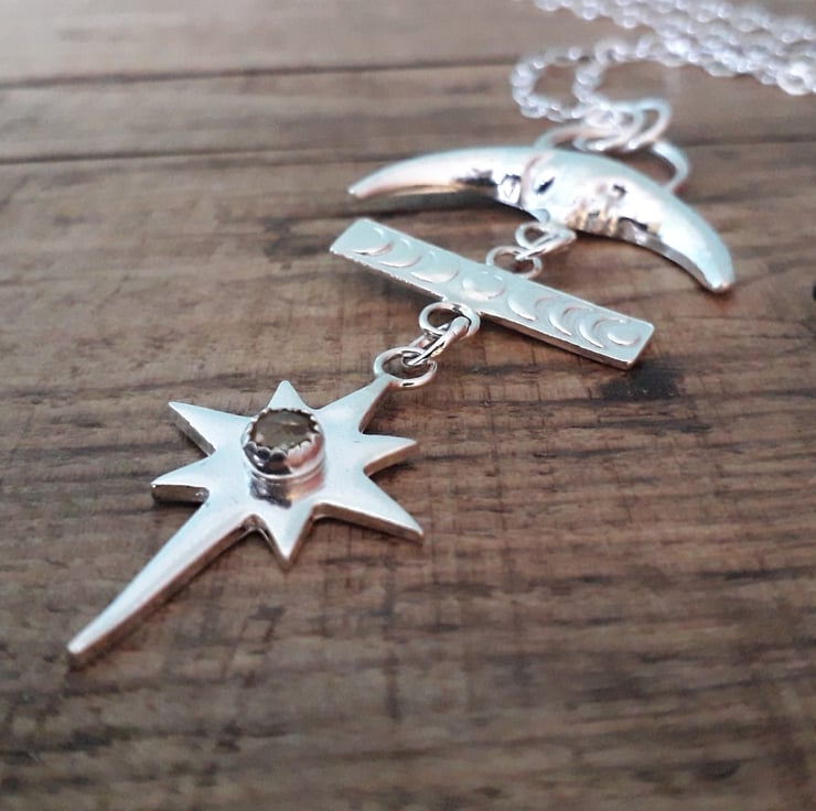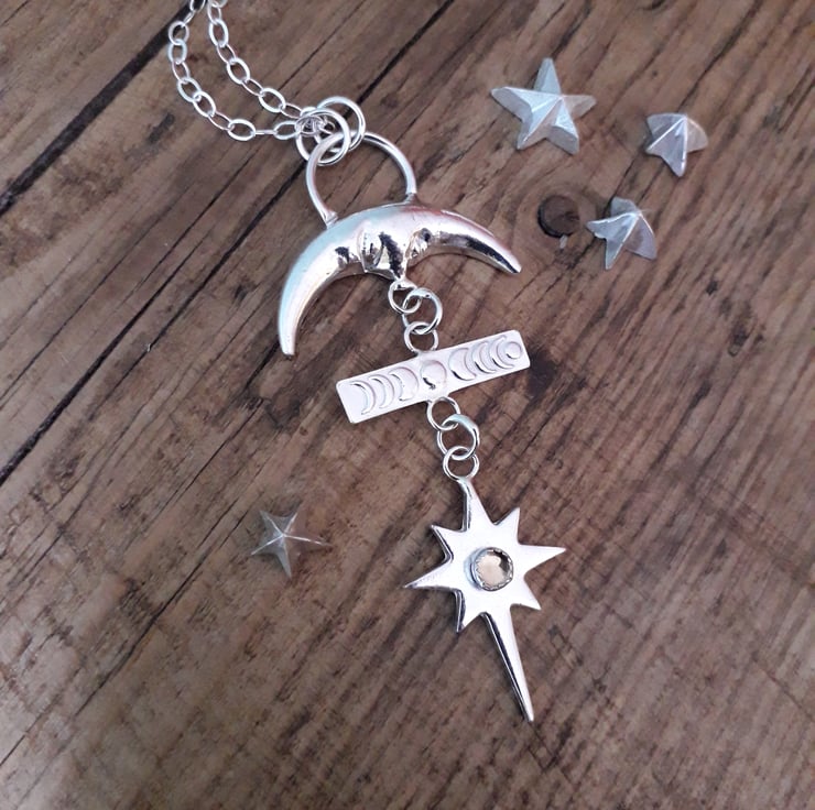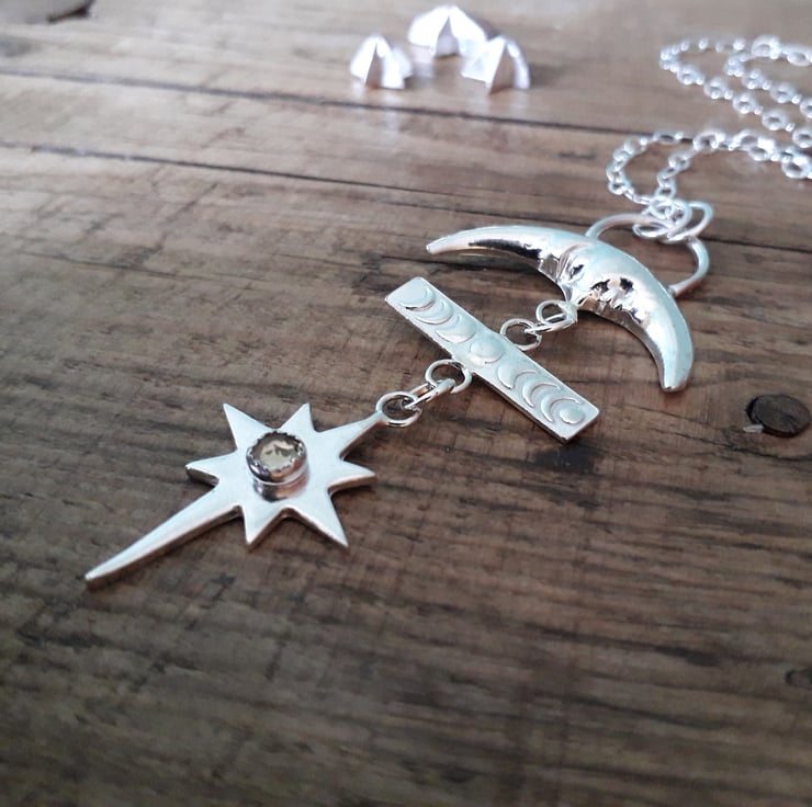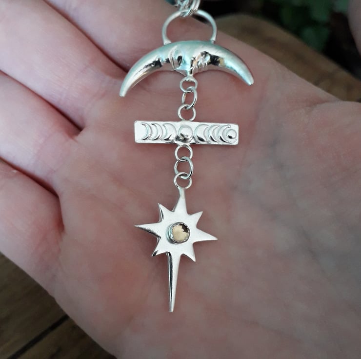 This is a beautiful statement necklace for all lover of celestial night sky magic. Having three tiers, it starts with a crescent moon man with a friendly and calm face, a rectangular moon phases bar and a bright north star with a pale yellow citrine.