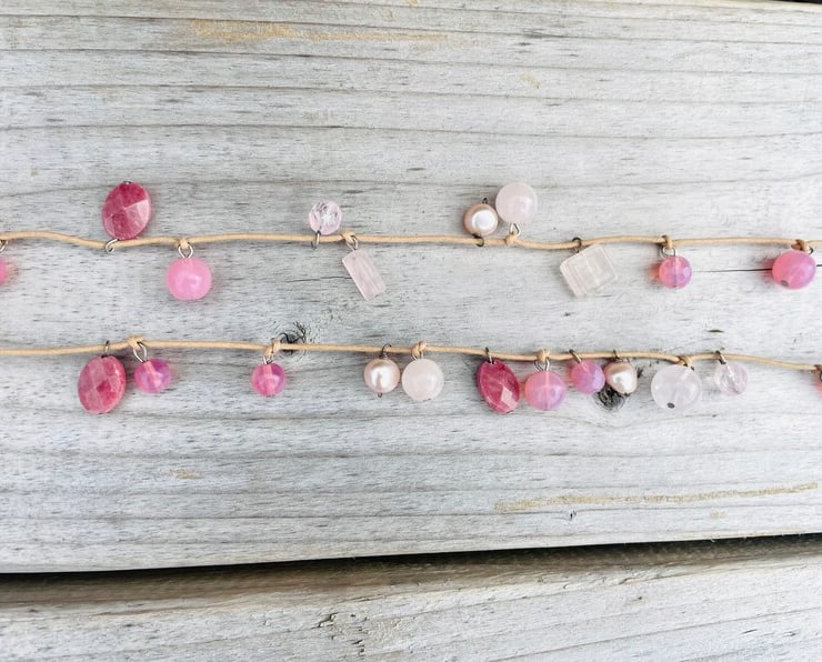 A very pretty lariat, it is one length so it can be worn as you would like to; as a long necklace, wrapped as a choker, wrapped around the wrist as a bracelet. It has many gemstones and pink freshwater pearls all along the neutral leather. Each gemstone and pearl is fixed to the leather using sterling silver Headpins. Just simply very pretty and s piece that I am very proud of.