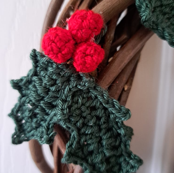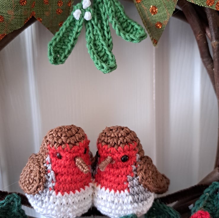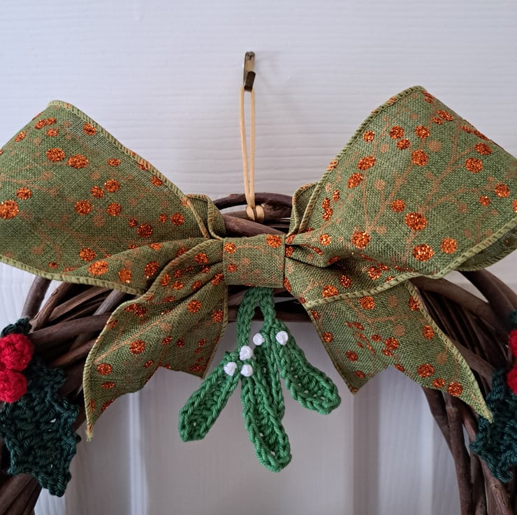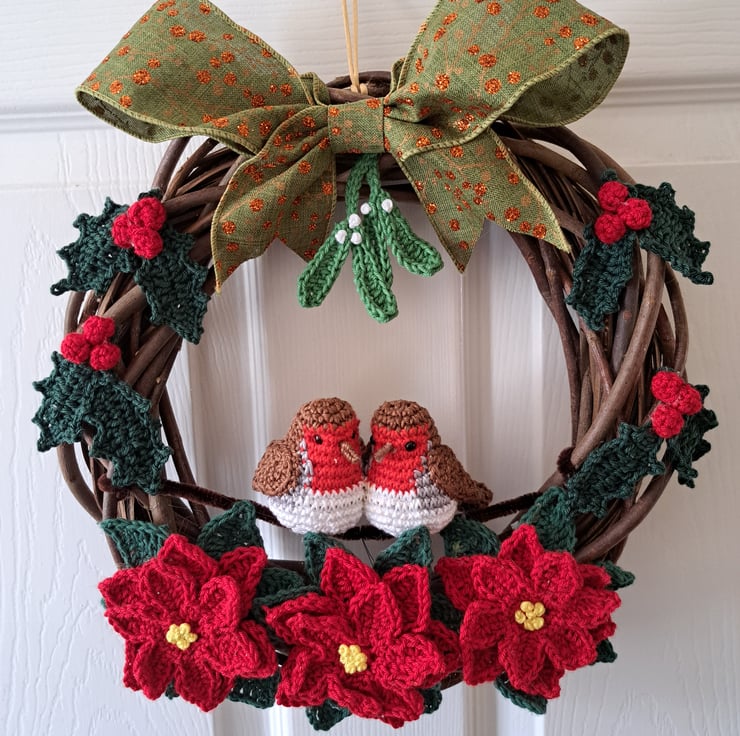 This charming handmade Christmas wreath is the perfect festive decoration for your home. It features two adorable, crocheted robins caught under the mistletoe, surrounded by lush green holly leaves and vibrant red poinsettias. The wreath is finished with a beautiful green bow, adding a touch of elegance.