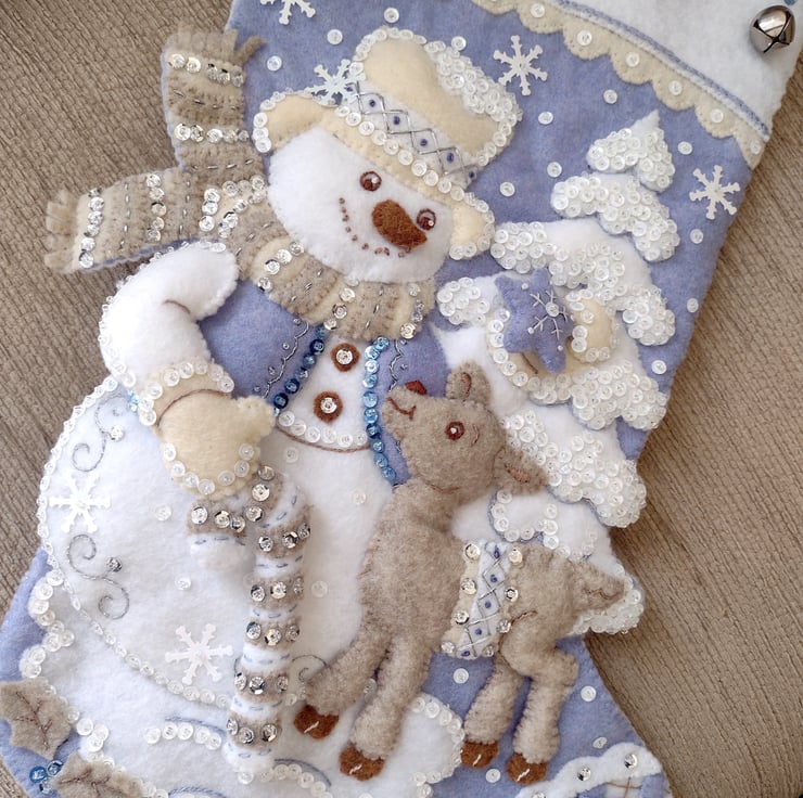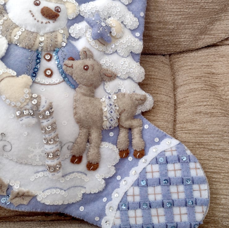 Hand completed keepsake felt stocking titled WINTER WONDERLAND by Bucilla with optional personalisation, featuring a dashing snowman with cosy scarf, candy cane and a little deer in the snow in brown, Ivory, white and blue.