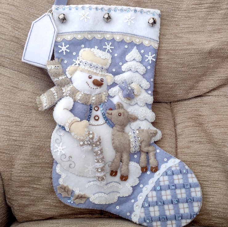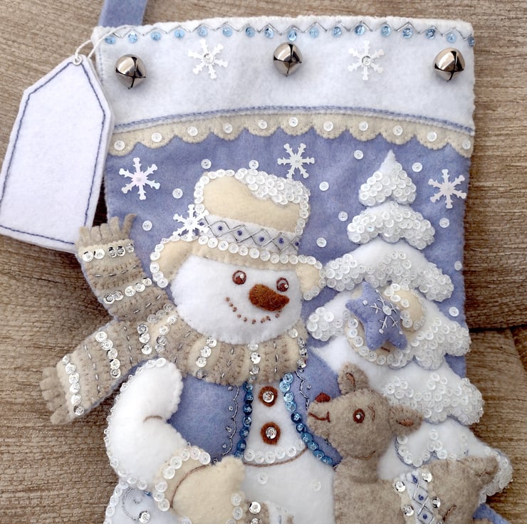 I have added silver bells and white snowflakes to the top of the stocking front as well as a white felt tag that can be personalised with a name or text of your choice in either blue or brown please leave details in the personalisation box, up to 8 letters. (Please note the text size will vary depending on number of letters required)