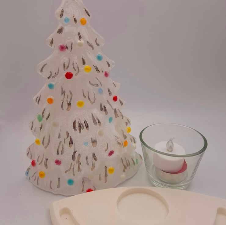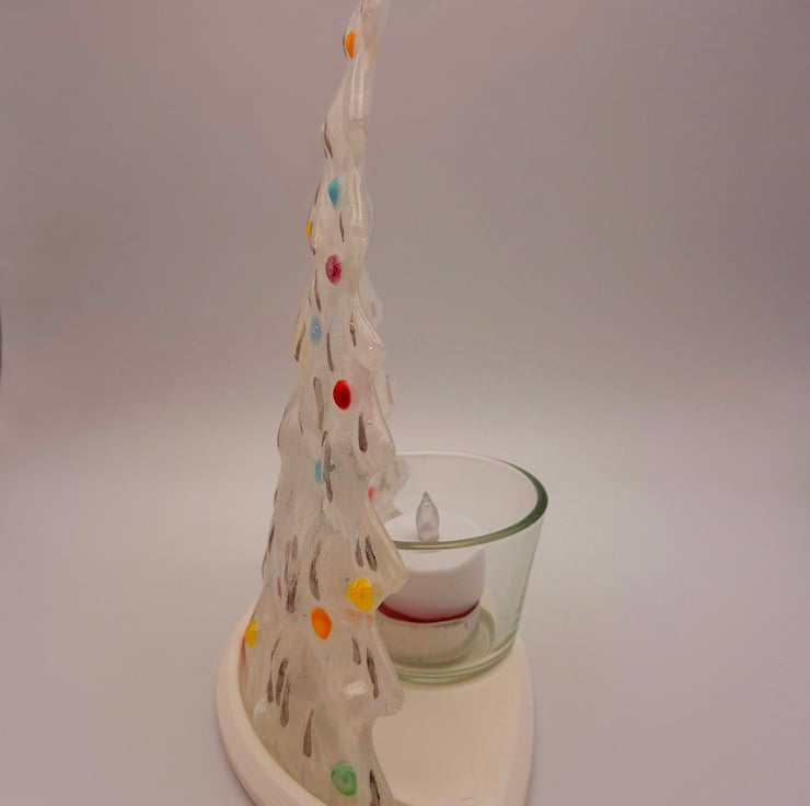Handmade fused glass Christmas tree candle holder. This Tree has an opaline glass body with a dichroic glass star. This is decorated with red, pink, orange, yellow, white and turquoise baubles and finished with real platinum lustre. The Tree is approximately 23cm tall, 16cm wide and 7cm deep. It has a 3D printed stand, approximately 20cm x 10.5cm x 1.5cm. A glass tealight holder is included. This piece is unique due to the nature of fusing glass.