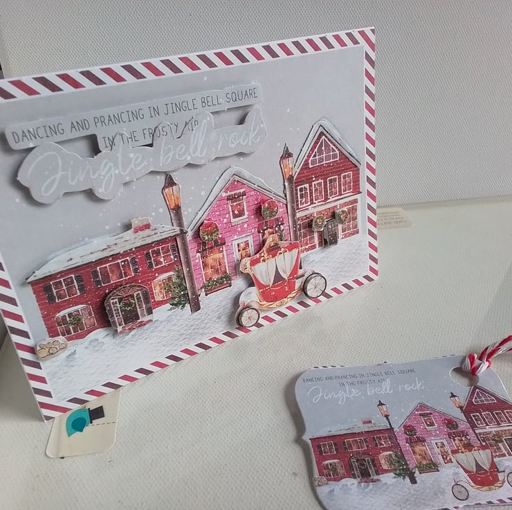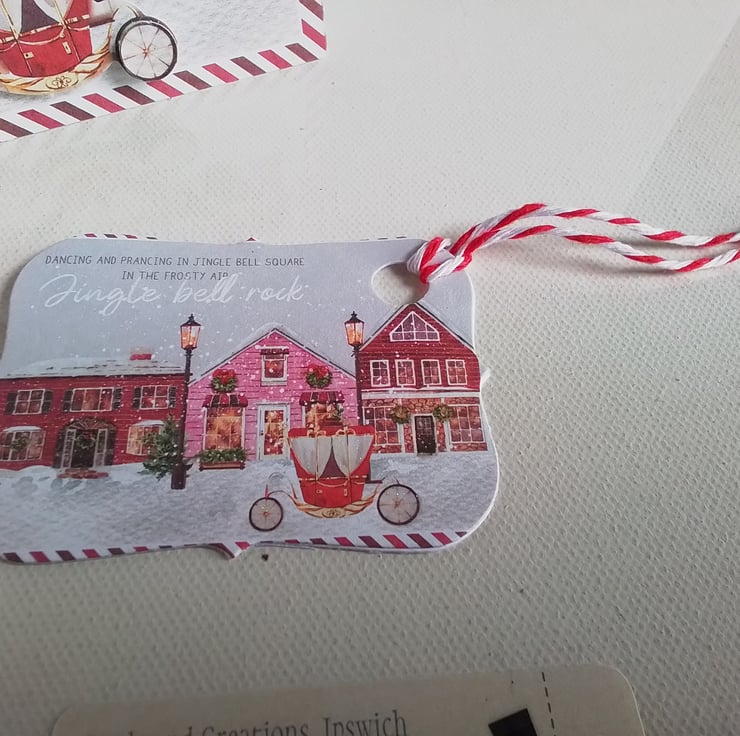 Handmade Christmas card and gift tag set with a theatrical theme reminding me of Cindarella and her carriage waiting for her.