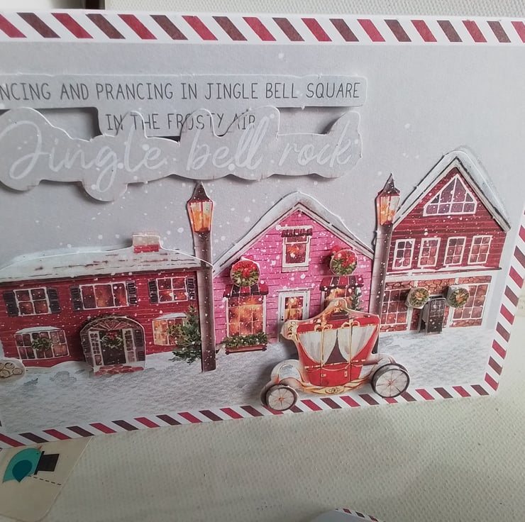 The scene of 3 houses decorated for Christmas with the carriage in the snow in jingle bell square.