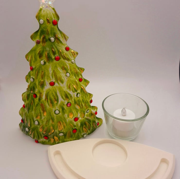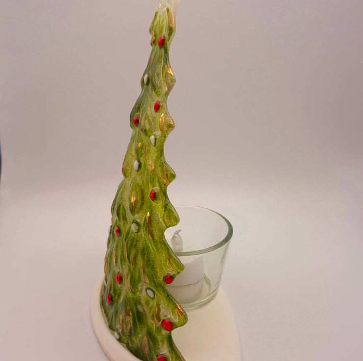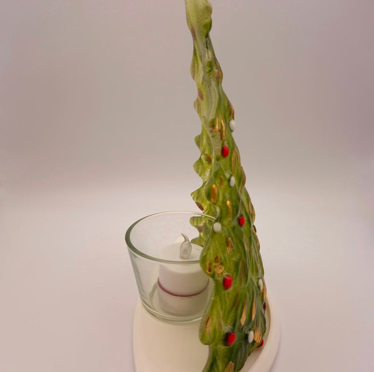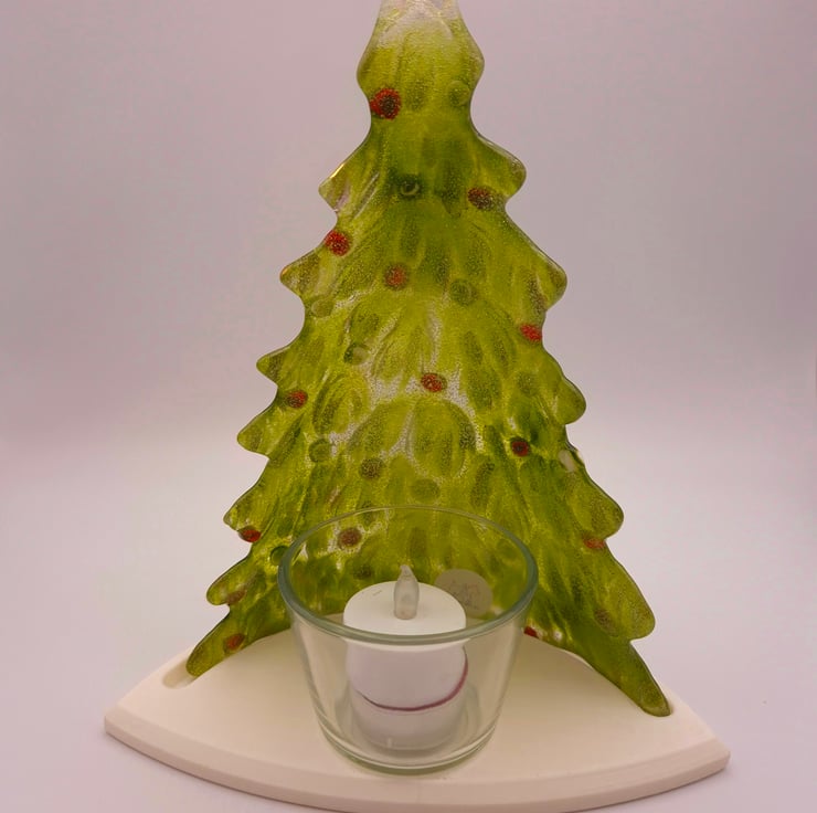 Handmade fused glass Christmas tree candle holder. This tree has a green glass body with a dichroic glass star. This is decorated with red and white baubles and finished with real gold lustre. The Tree is approximately 23cm tall, 16cm wide and 7cm deep. It has a 3D printed stand, approximately 20cm x 10.5cm x 1.5cm. A glass tealight holder is included. This piece is unique due to the nature of fusing glass.