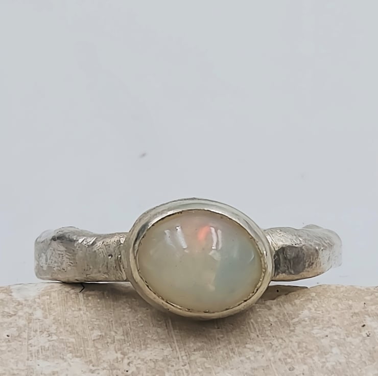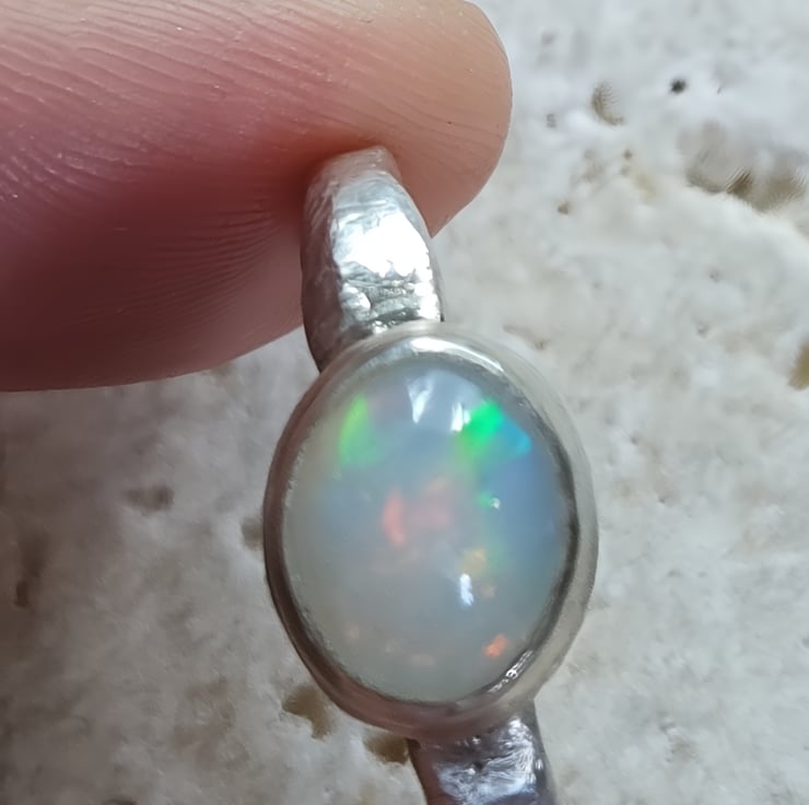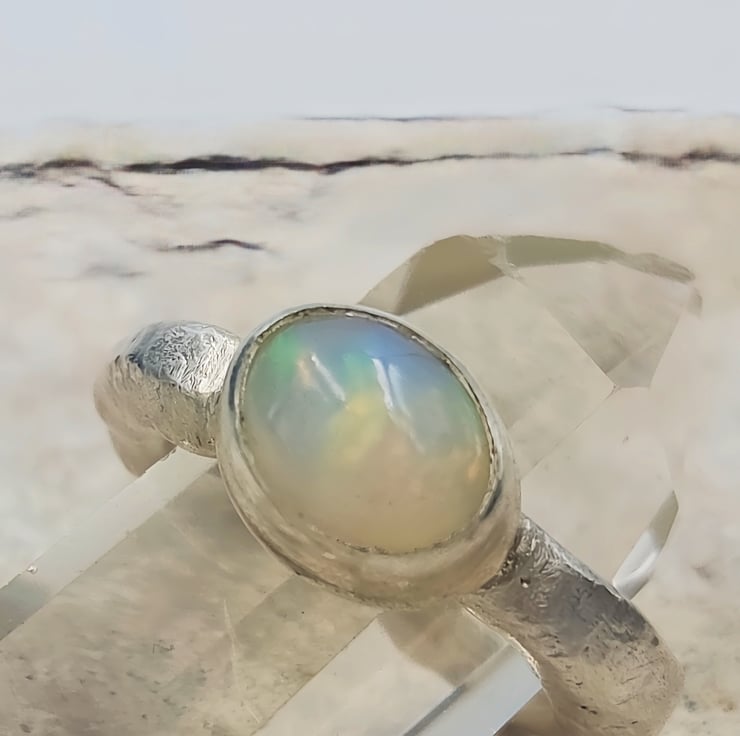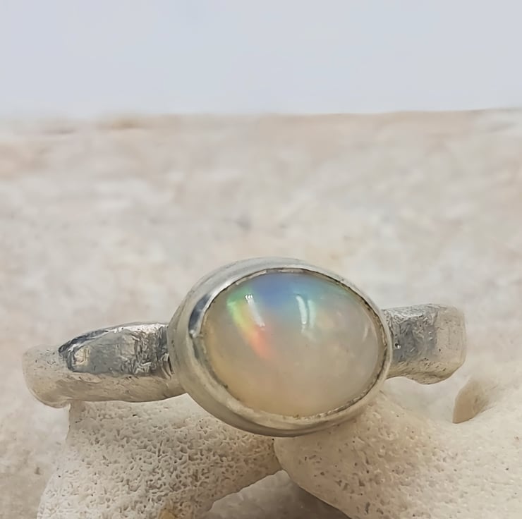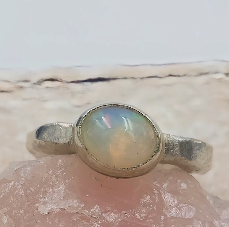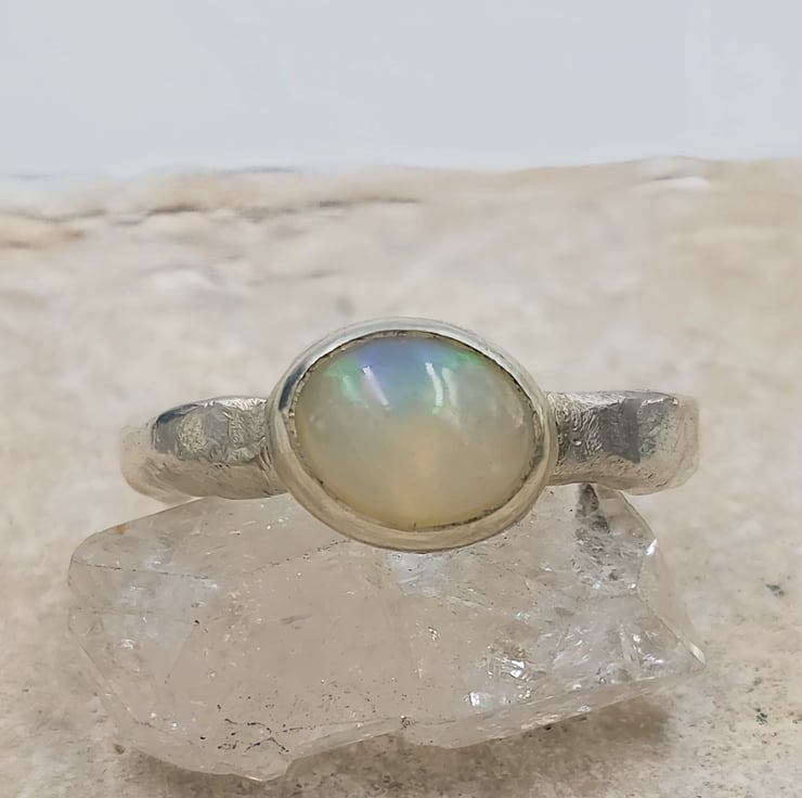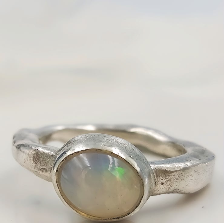 Illuminate your style with this Handmade Silver Ring featuring a stunning White Ethiopian Opal. Crafted with care, this unique ring showcases the vibrant play-of-colour that Ethiopian opals are known for, capturing hues of blue, green, orange, and red that shift beautifully with the light. Set in a molten silver band, this ring is both elegant and striking, making it the perfect accessory for any occasion. Whether you're dressing up for a special event or adding a pop of colour to your everyday look, this one-of-a-kind piece is sure to make a statement.
