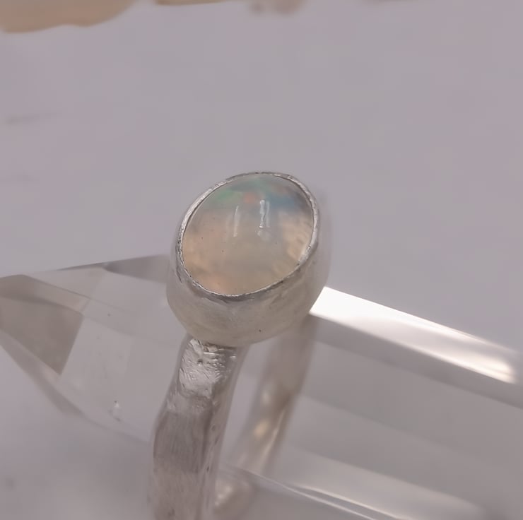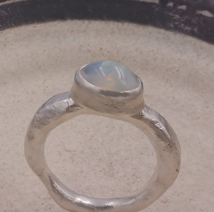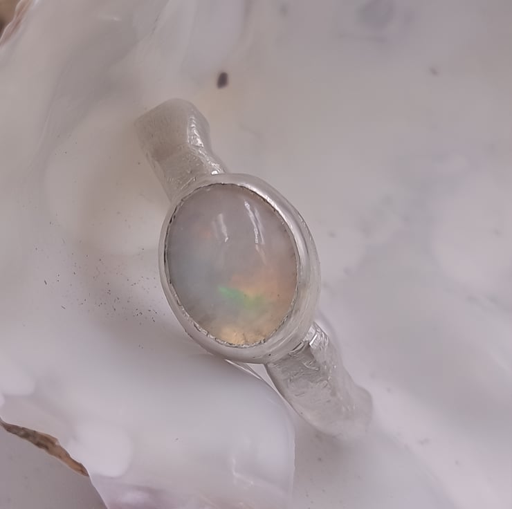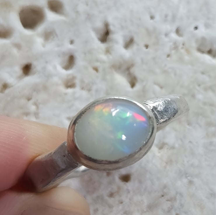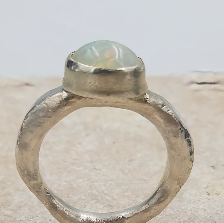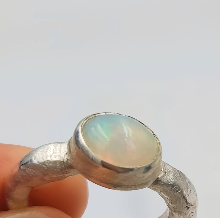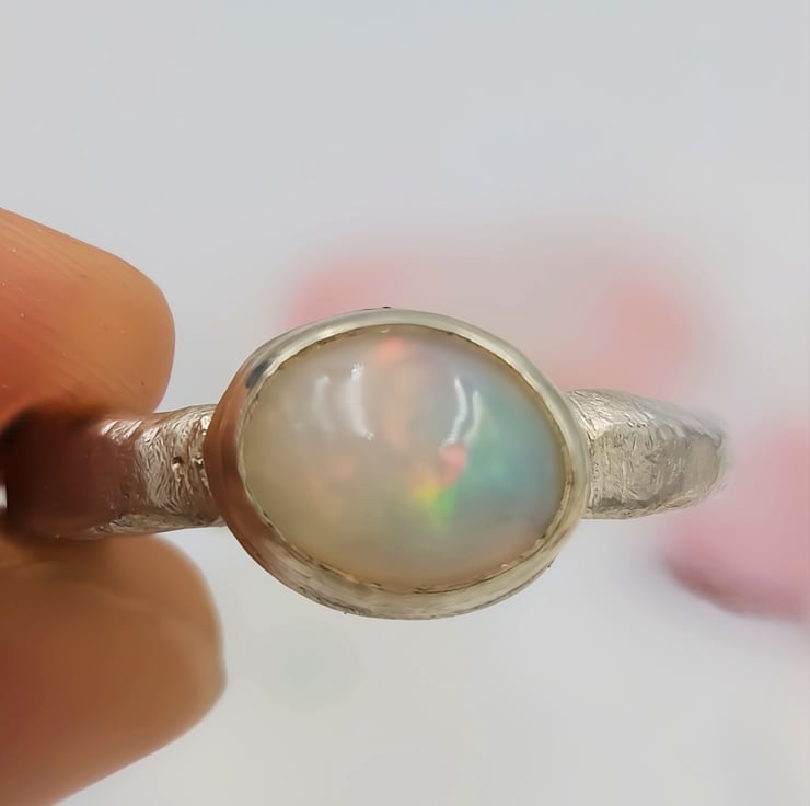 Illuminate your style with this Handmade Silver Ring featuring a stunning White Ethiopian Opal. Crafted with care, this unique ring showcases the vibrant play-of-colour that Ethiopian opals are known for, capturing hues of blue, green, orange, and red that shift beautifully with the light. Set in a molten silver band, this ring is both elegant and striking, making it the perfect accessory for any occasion. Whether you're dressing up for a special event or adding a pop of colour to your everyday look, this one-of-a-kind piece is sure to make a statement.