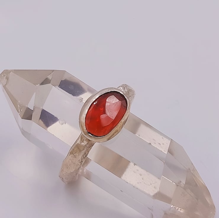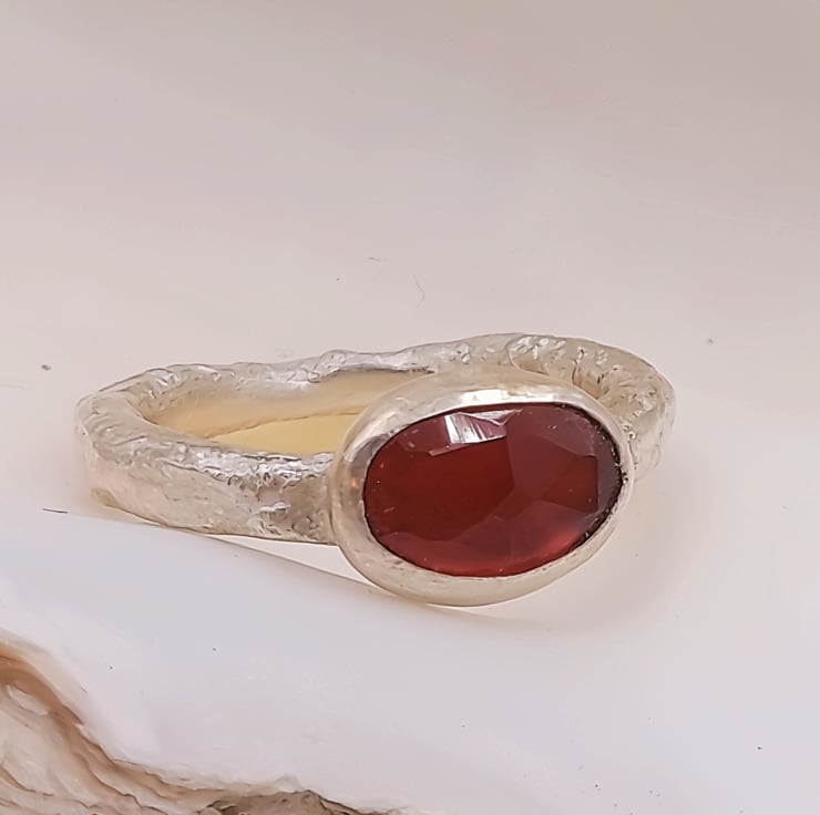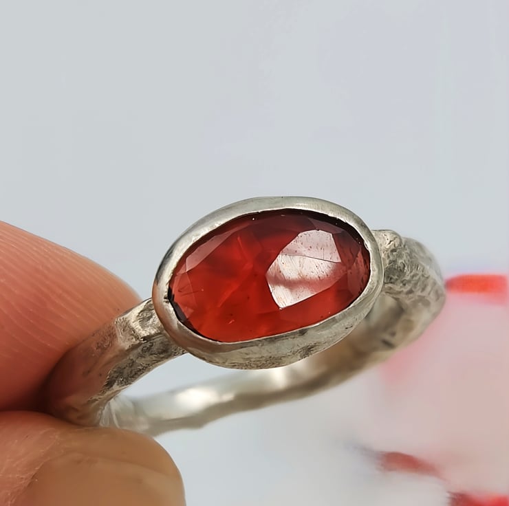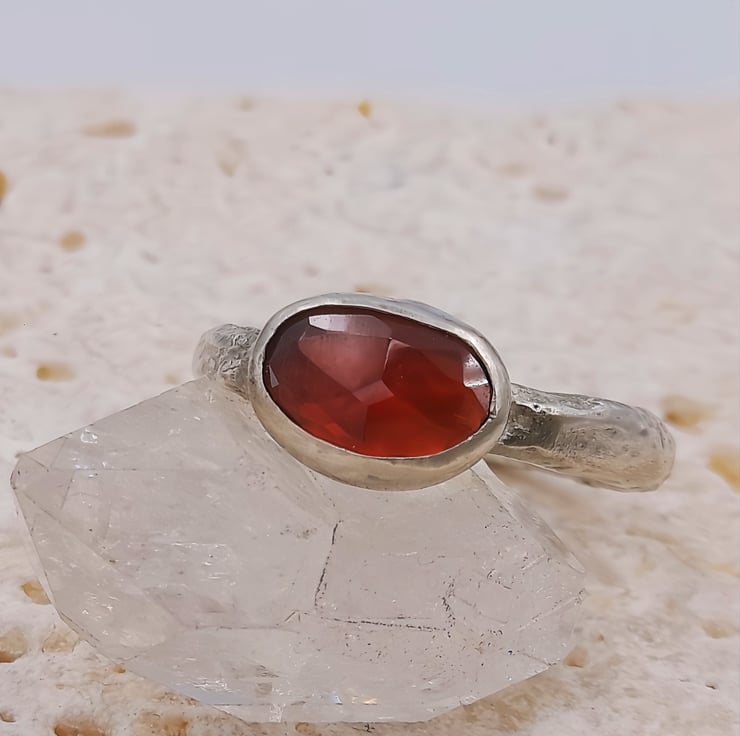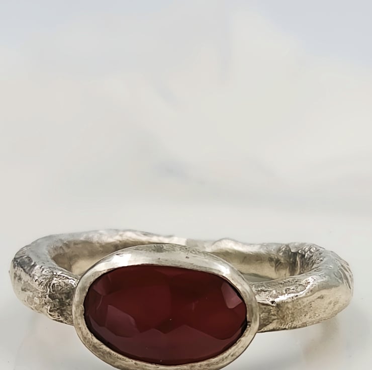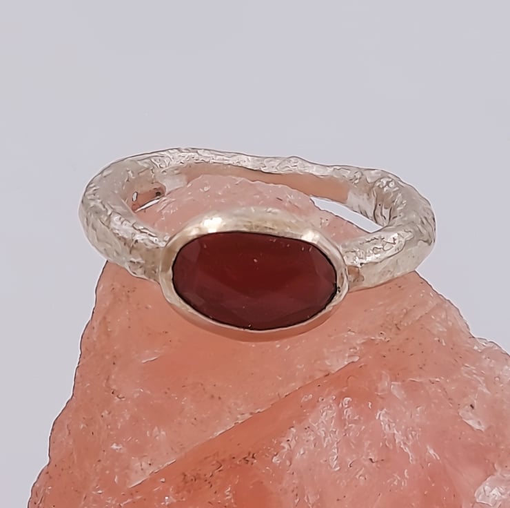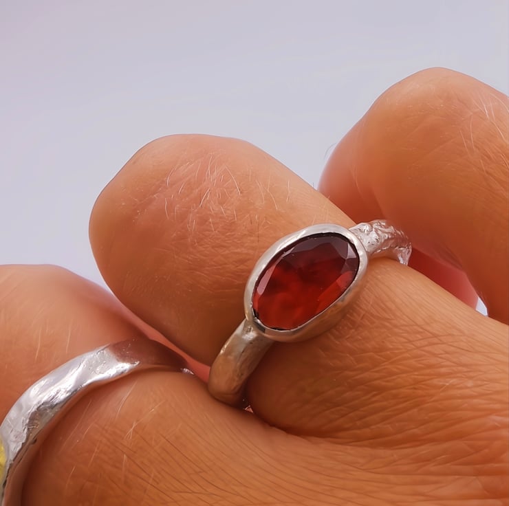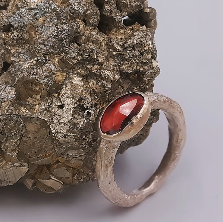 This striking ring features a faceted garnet slice set in a textured silver band, blending bold elegance with natural beauty. The deep red hues of the garnet are beautifully complemented by the rustic, handcrafted texture of the silver, giving the ring a unique, earthy charm. The organic design and minimalist setting allow the natural beauty of the gemstone to shine through. Perfect for those who appreciate artisan craftsmanship, this ring makes a distinctive statement whether worn alone or stacked with other pieces.