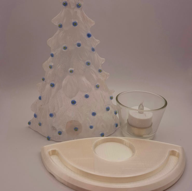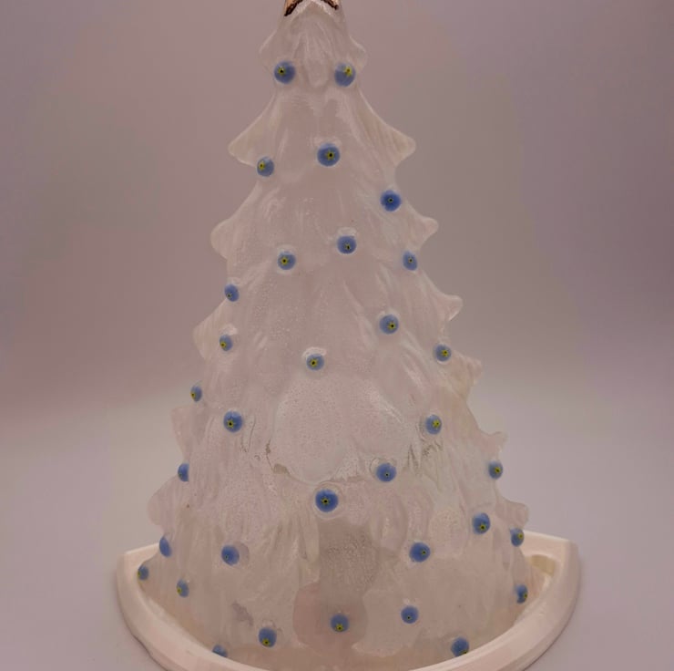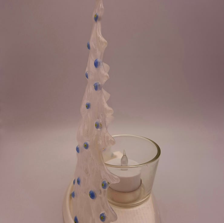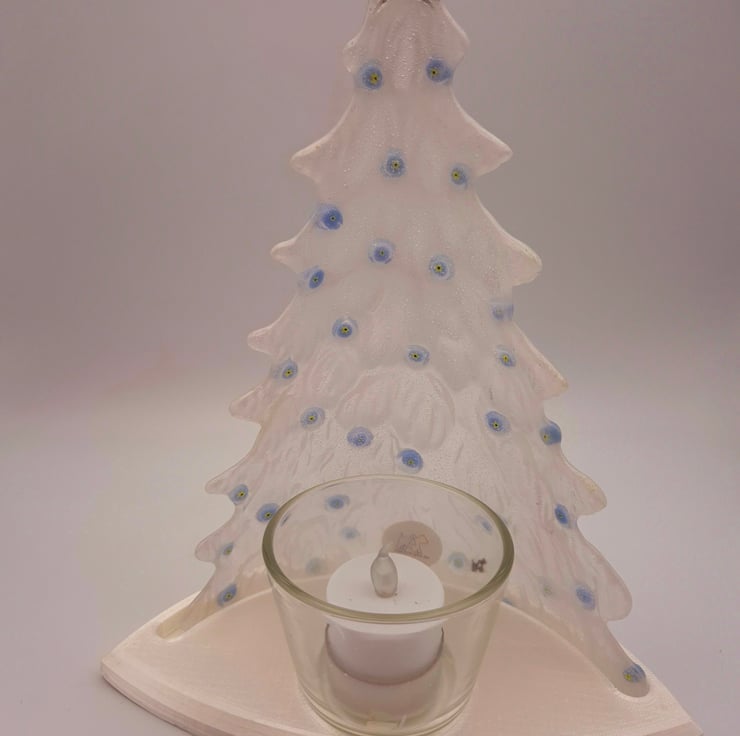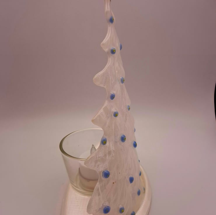 Handmade fused glass Christmas tree candle holder. This tree has an opaline glass body with a platinum lustre star. This is decorated with blue baubles with yellow and black centres and finished with real platinum lustre. The Tree is approximately 23cm tall, 16cm wide and 7cm deep. It has a 3D printed stand, approximately 20cm x 10.5cm x 1.5cm. A glass tealight holder is included. This piece is unique due to the nature of fusing glass.