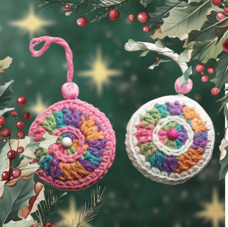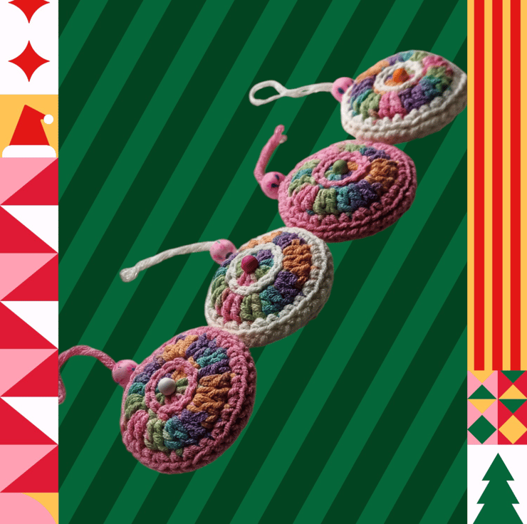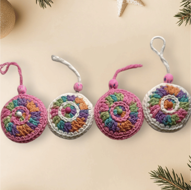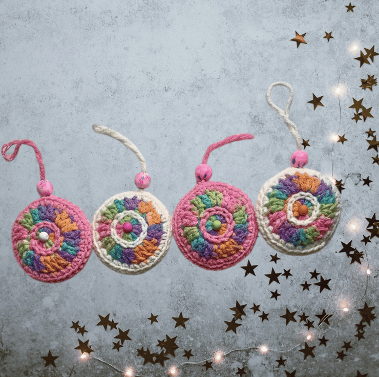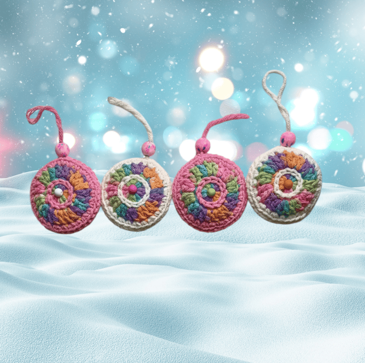 If you like a pastel vibe for your Christmas tree, this set of 4 crocheted ornaments could be perfect for you. They come in a little organza bag so they can be put away safely year after year. 6 cm diameter.