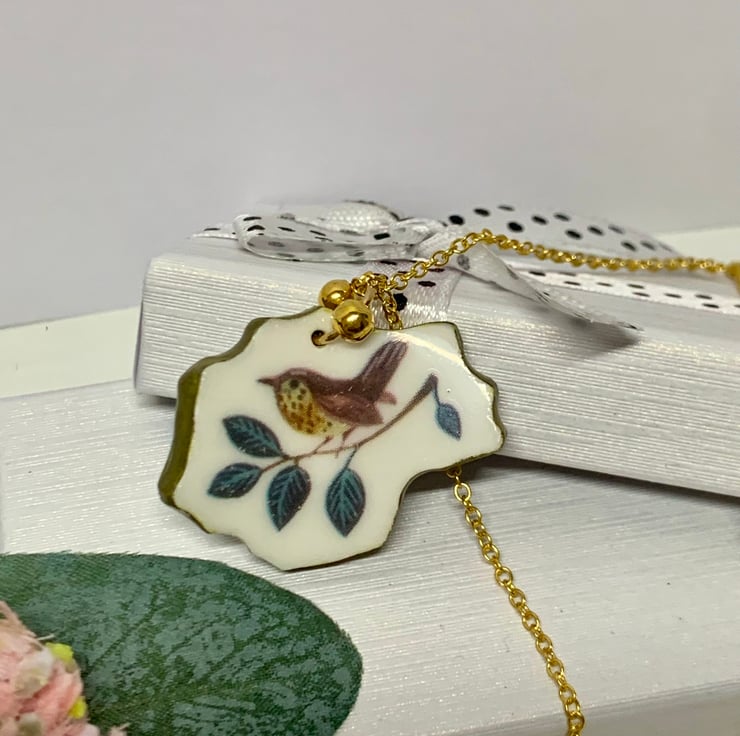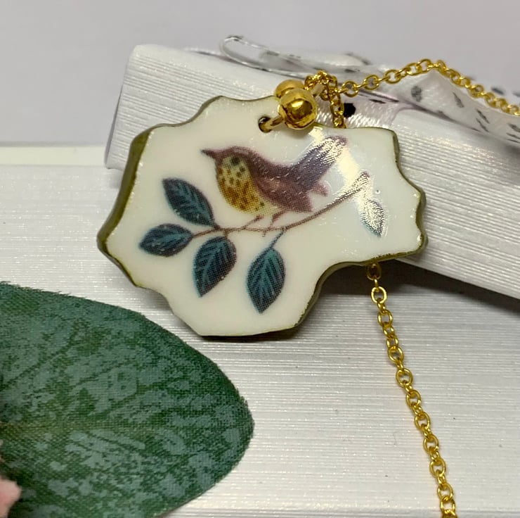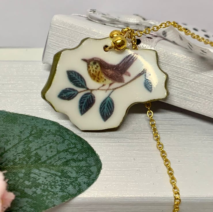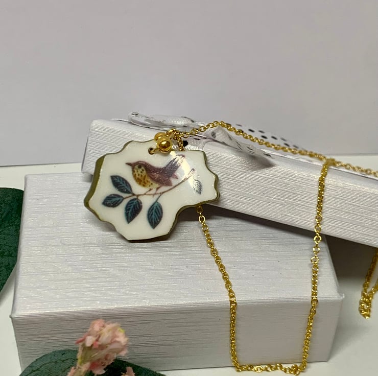 If you love Birds then this unique piece is just the thing for you. This pretty bird sat on a delicate branch pendant has been made from a piece of porcelain plate. Hand shaped using only a small hand held dremel. I finished the pendant by edging with a bronze coloured paint to compliment the colours of the bird. It comes hung on a 18" Gold Plated chain.