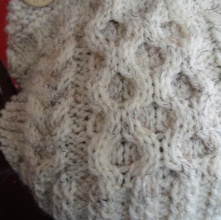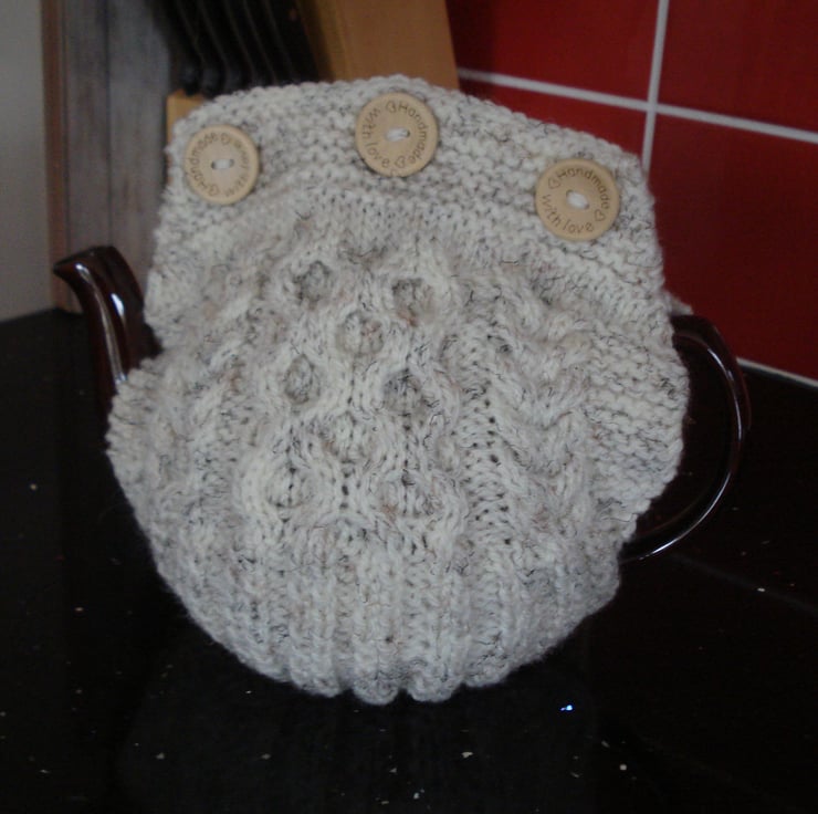 This is a really neat tea cosy it has cables and also six "Handmade With Love" buttons across the top. Knitted with a wool and acrylic Aran in an oatmeal colour with fine strands of black. Would fit a three to four cup teapot.