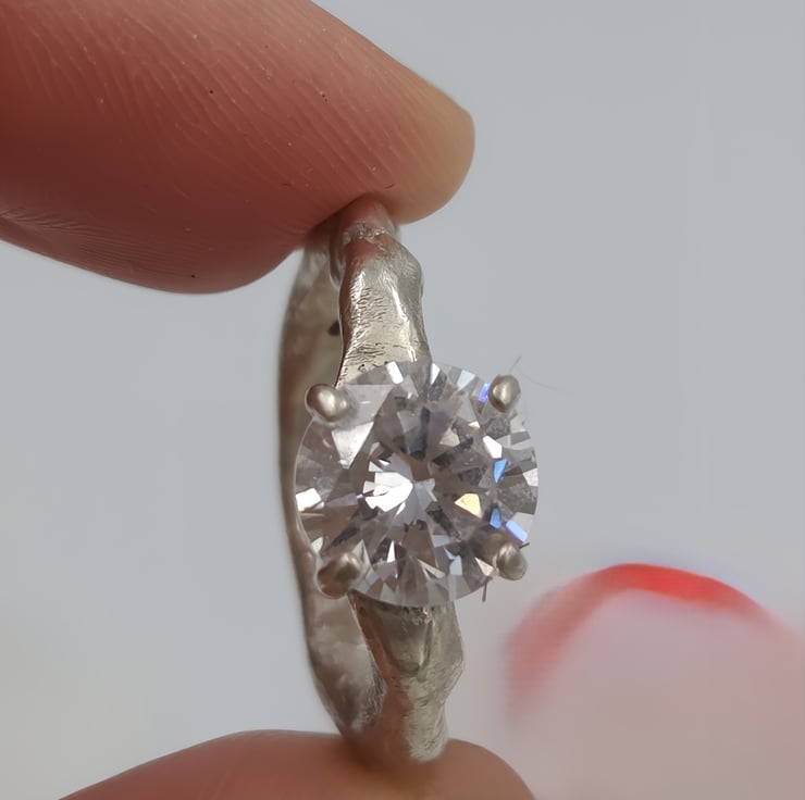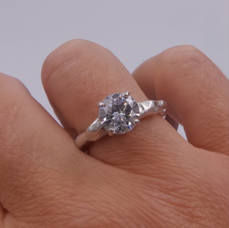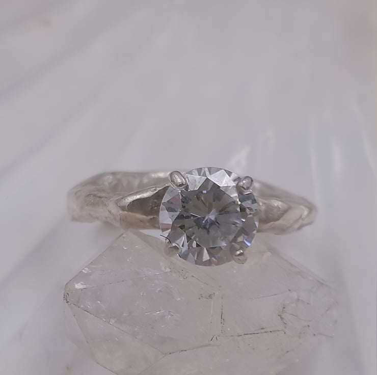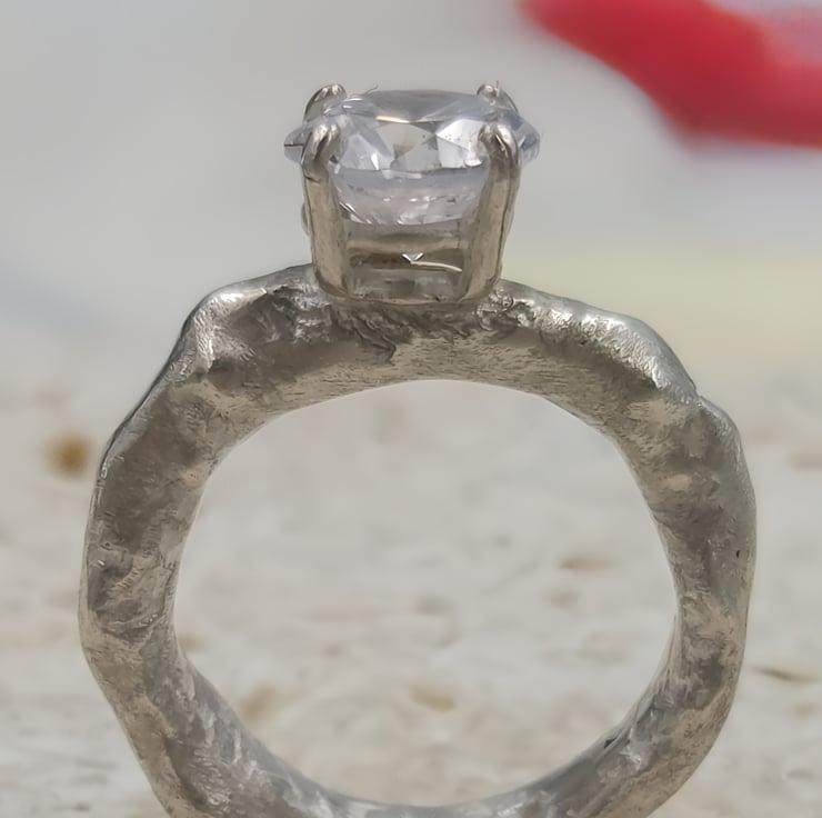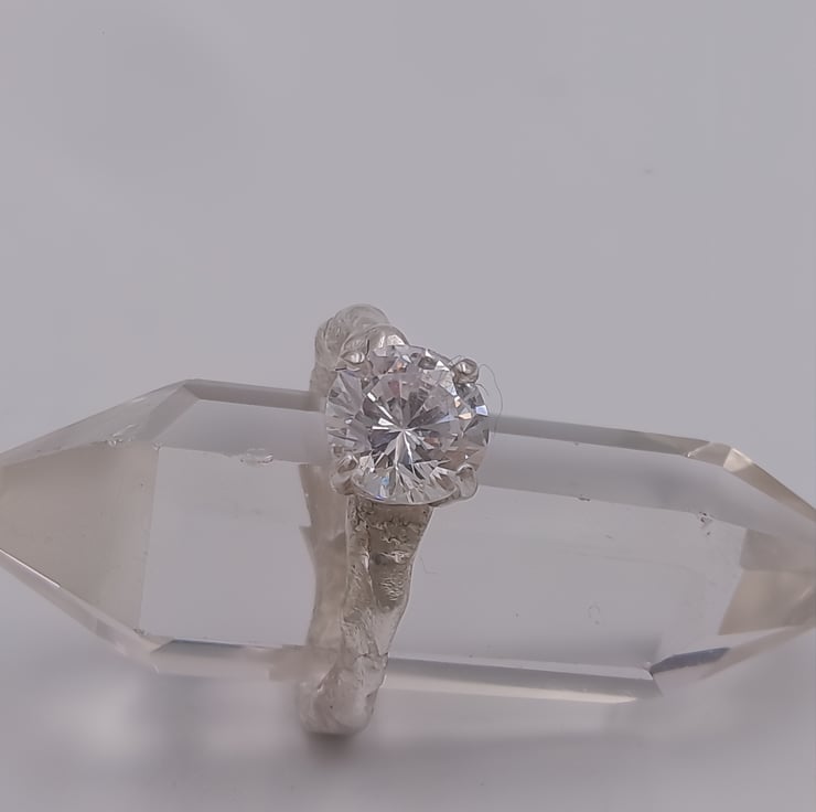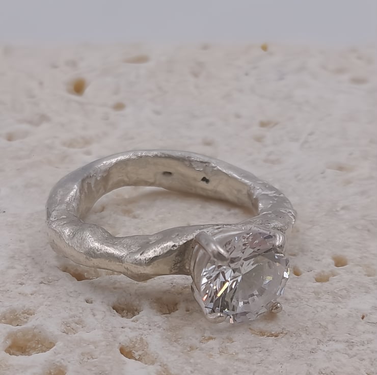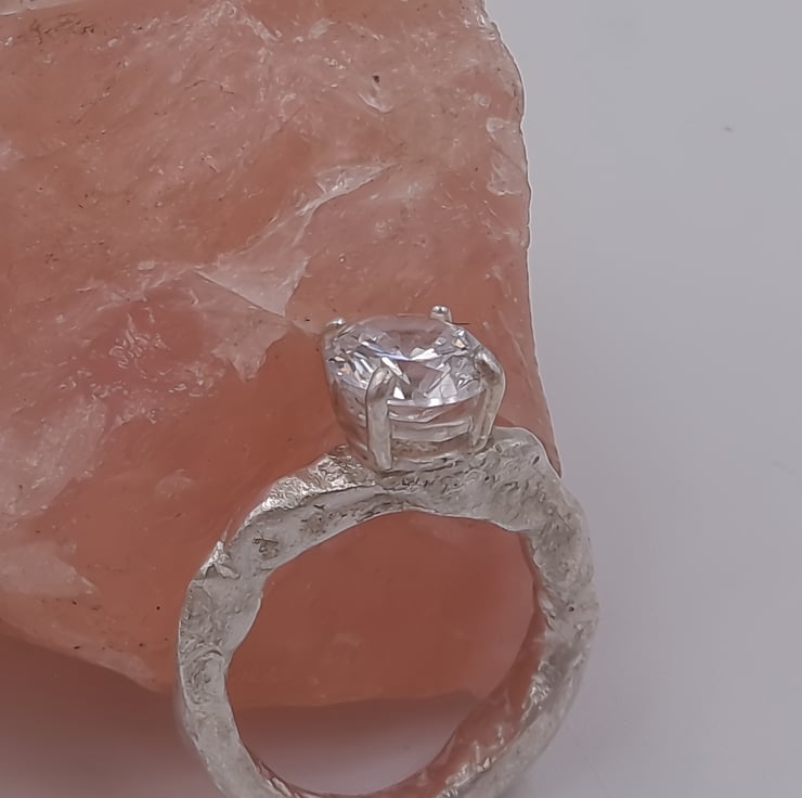 This elegant ring combines a raw, organic aesthetic with refined sparkle. Handcrafted in textured silver, the band features a rustic, uneven surface that gives it a unique and artisanal feel. At its centre is a brilliant white cubic zirconia stone, set in a minimalist prong setting that allows the gem to shine brilliantly from all angles. This ring makes a perfect statement piece for those who appreciate understated luxury and natural beauty. Ideal for special occasions or as an unconventional engagement ring.
