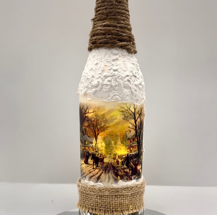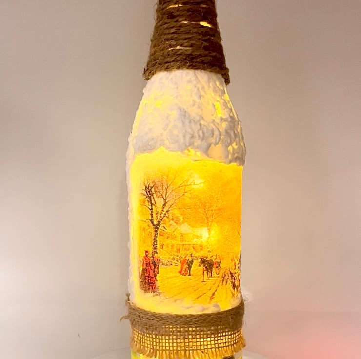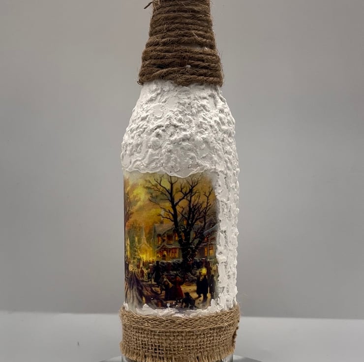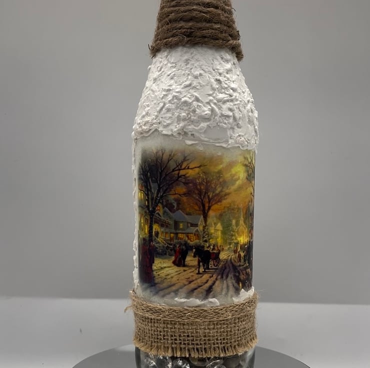 A one of a kind up cycled bottle with winter scenery, surrounded by a beautiful texture effect. Base of bottle is filled with decorative stones and acrylic beads. Neck of bottle is finished with burlap/twine.