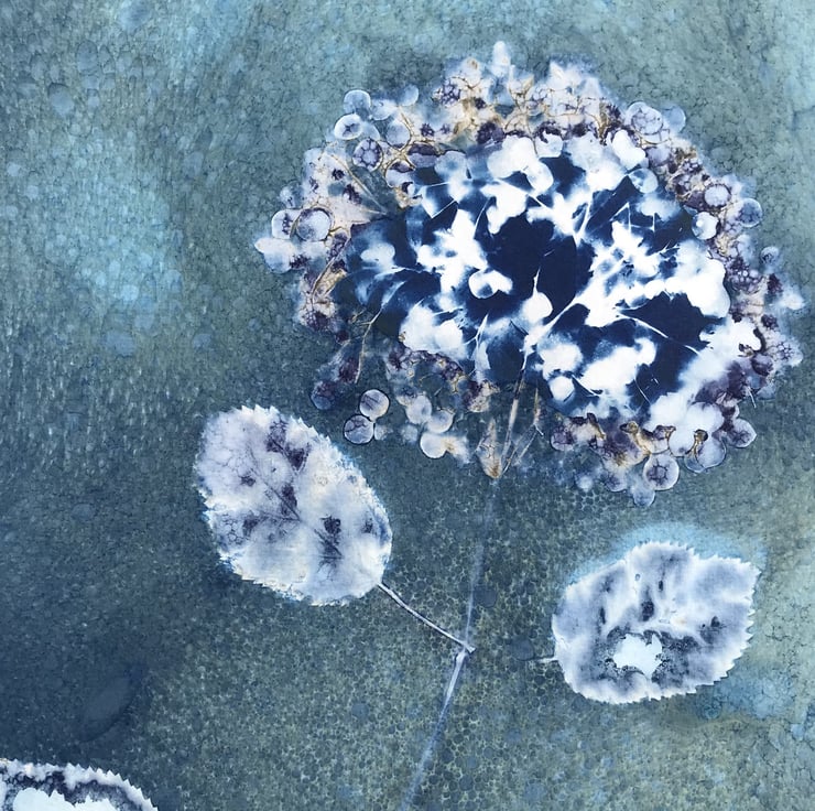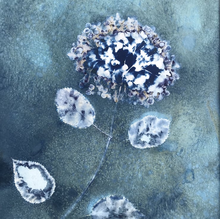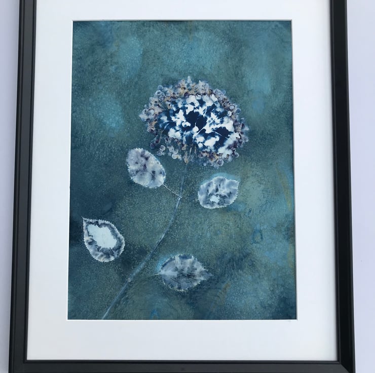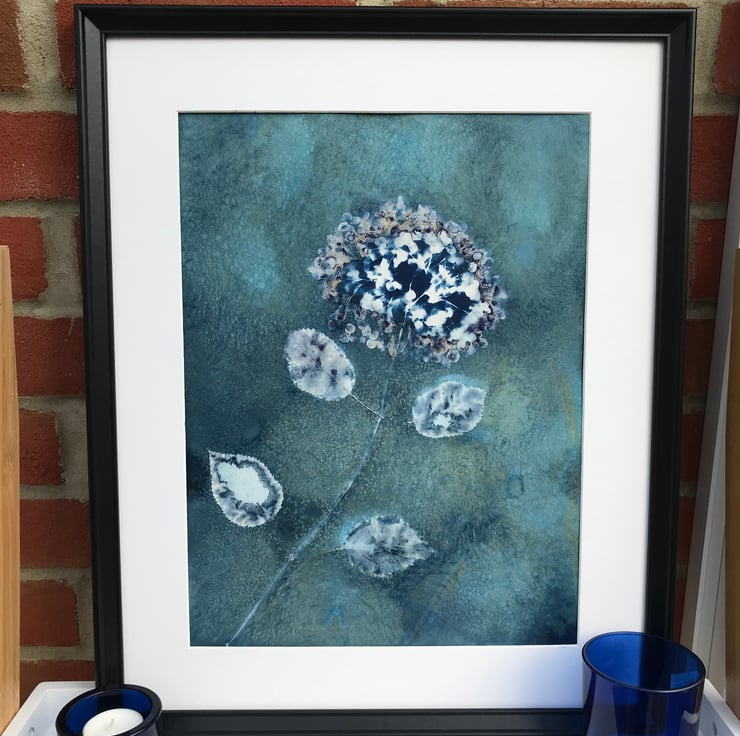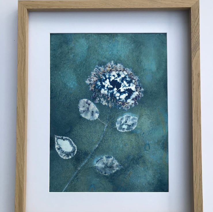 This Photogram was made using the Wet Cyanotype technique, which means adding a gentle mist of dilute vinegar and some bubbles onto the paper before exposure to the sun. The results are a lovely variety of blues, greens and browns, giving the print a unique look. Recognisable as a hydrangea by the delicate flowers growing from their twiggy stems, giving the classic Hydrangea puffball shape.